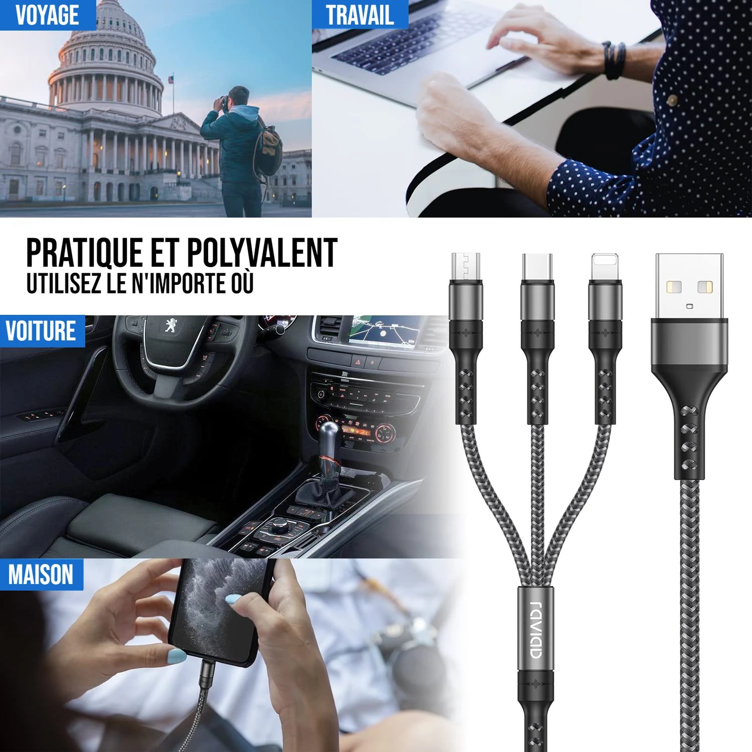Câble USB-A vers Multi USB (USB-C / Lightning / Micro-USB)