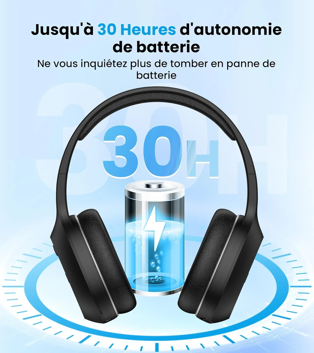 ♫ Autonomie Exceptionnelle de 30 Heures : Profitez de votre musique sans interruption pendant de longues heures. Notre casque offre jusqu’à 30 heures d’autonomie grâce à sa grande capacité de batterie. Plus besoin de vous soucier de tomber à court de batterie pendant vos déplacements 🔋.