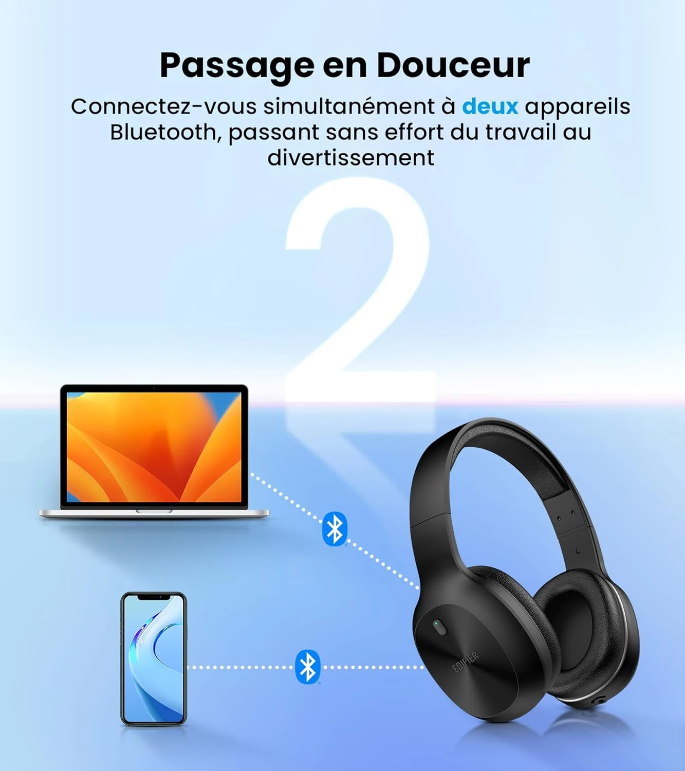 ♫ Connexion Double : Connectez-vous simultanément à deux appareils Bluetooth. Passez facilement du travail au divertissement, sans avoir à réapparier constamment. Soyez polyvalent et restez connecté 📱.