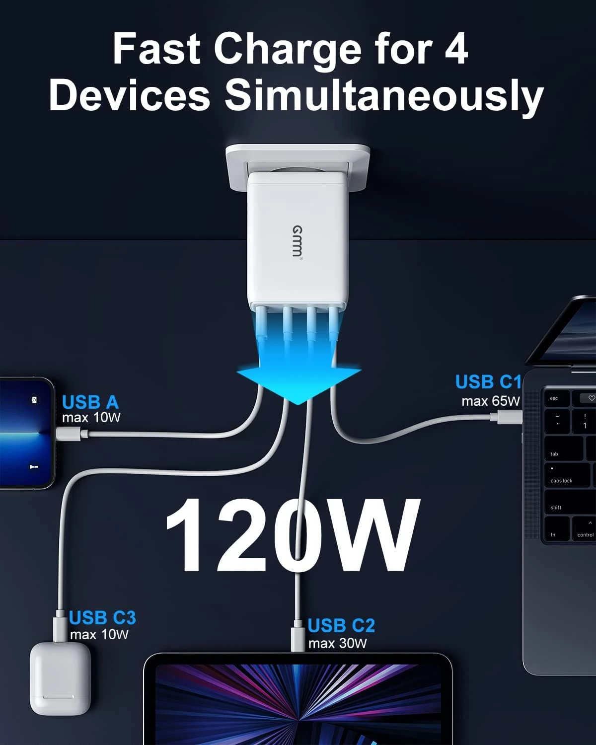 Avec sa configuration 4 en 1, ce chargeur polyvalent est équipé de 3 ports USB C PD et 1 port USB QC, ce qui vous permet de charger simultanément plusieurs appareils. Grâce à une puissance totale maximale de 120W, ce chargeur est capable de recharger efficacement deux ordinateurs portables en même temps. Veuillez noter que pour atteindre une sortie de 100W, l’utilisation d’un câble 5A est nécessaire.
