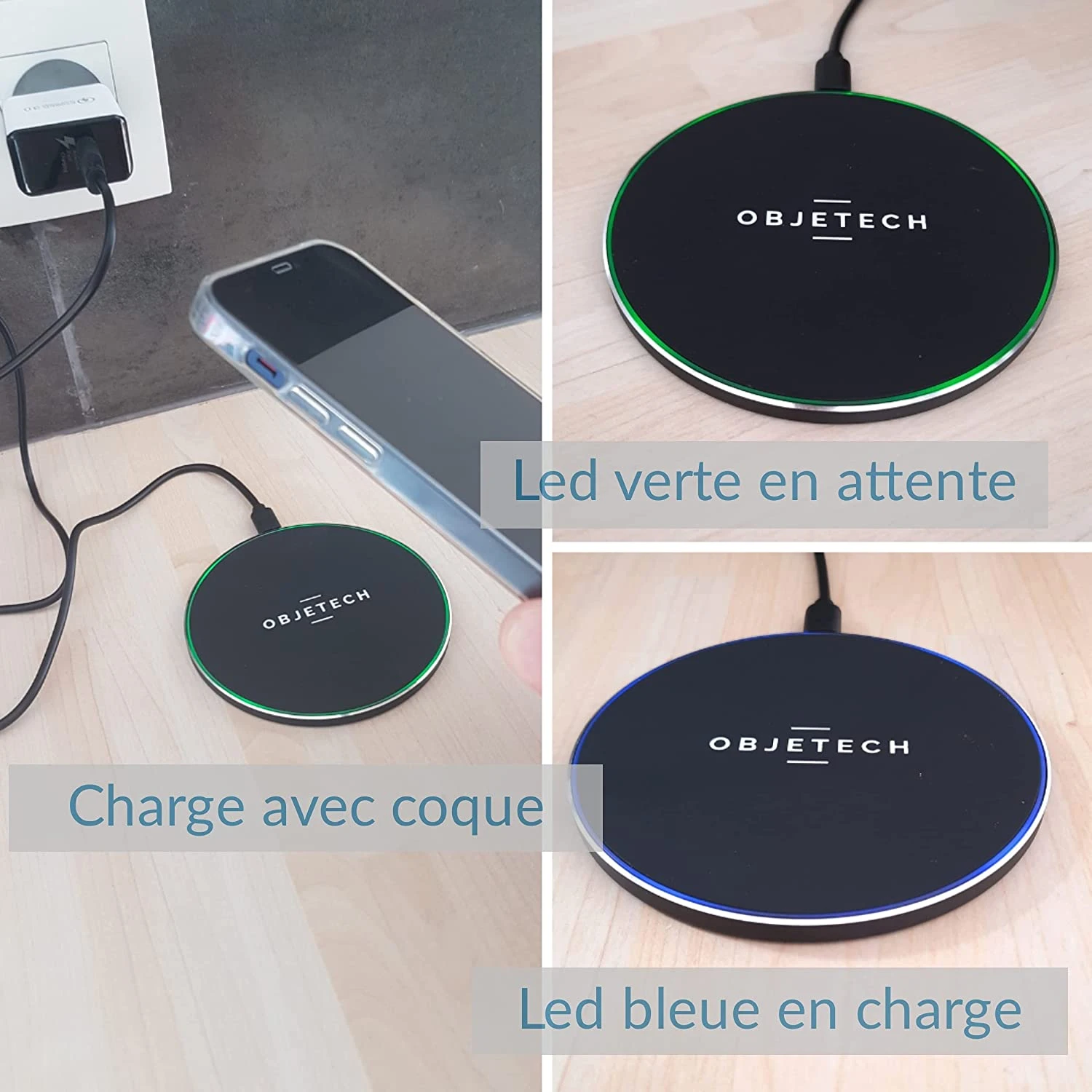 Il vous suffit de brancher le chargeur sur une prise secteur, de poser votre téléphone (même avec une coque de protection), et la recharge démarre instantanément. Une lumière bleue vous indique que tout fonctionne parfaitement.