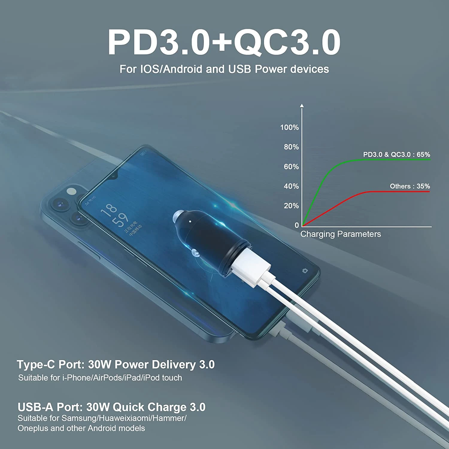 Notre Chargeur de smartphone pour voiture a une tension régulable de 12 à 24 Volts (12/24V) et une puissance de 30 watts au total rechargeant ainsi les GSM rapidement (iPhone 13 de 0% à 50% en env. 30 minutes) ❤️.