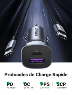 Notre Chargeur pour voiture se branche sur l’entrée Allume Cigare de n’importe quelle voiture 🚗. Notre modèle est superpuissant (30 Watts) et peut recharger un téléphone portable, une tablette ou autres appareils électroniques très rapidement 👍.