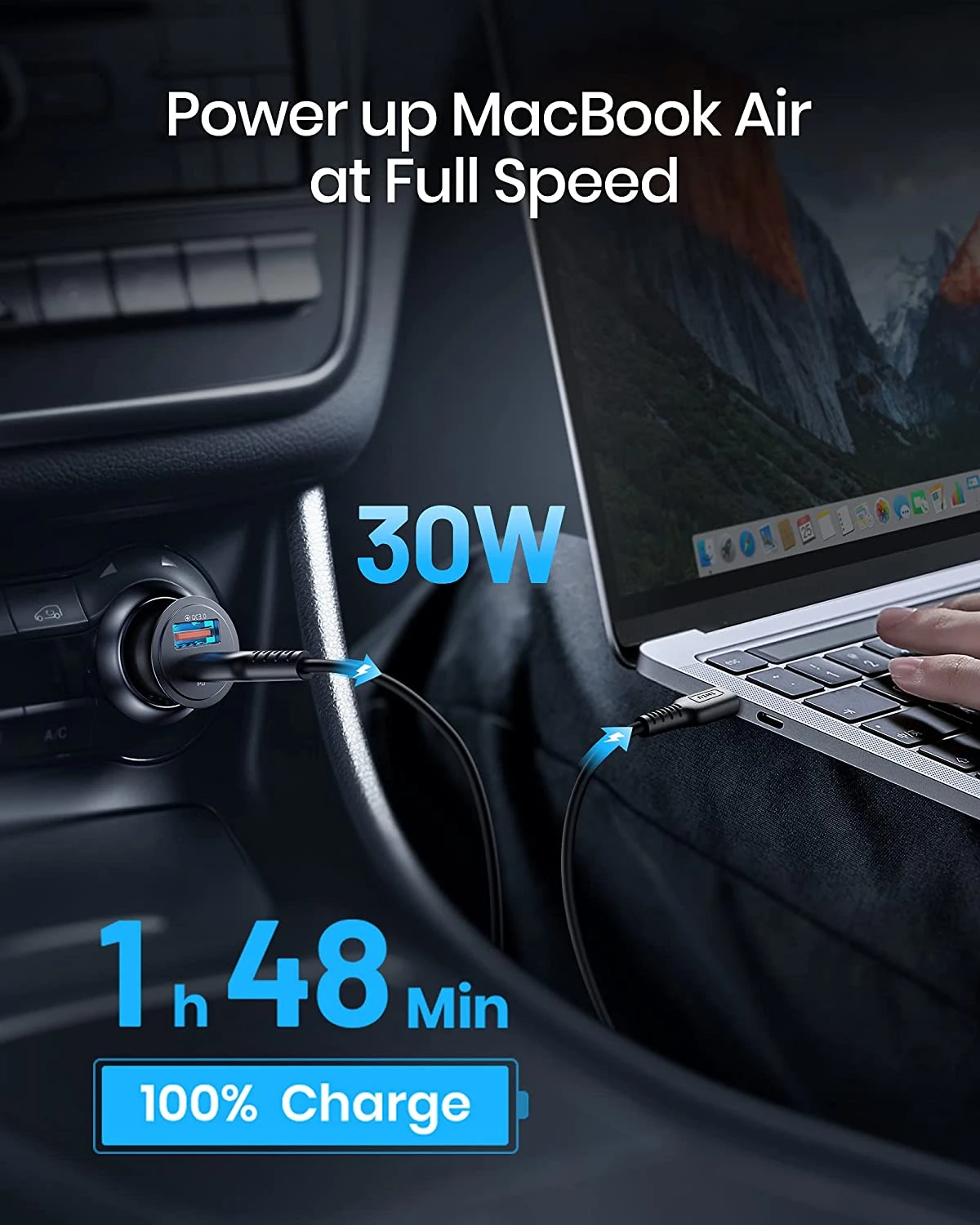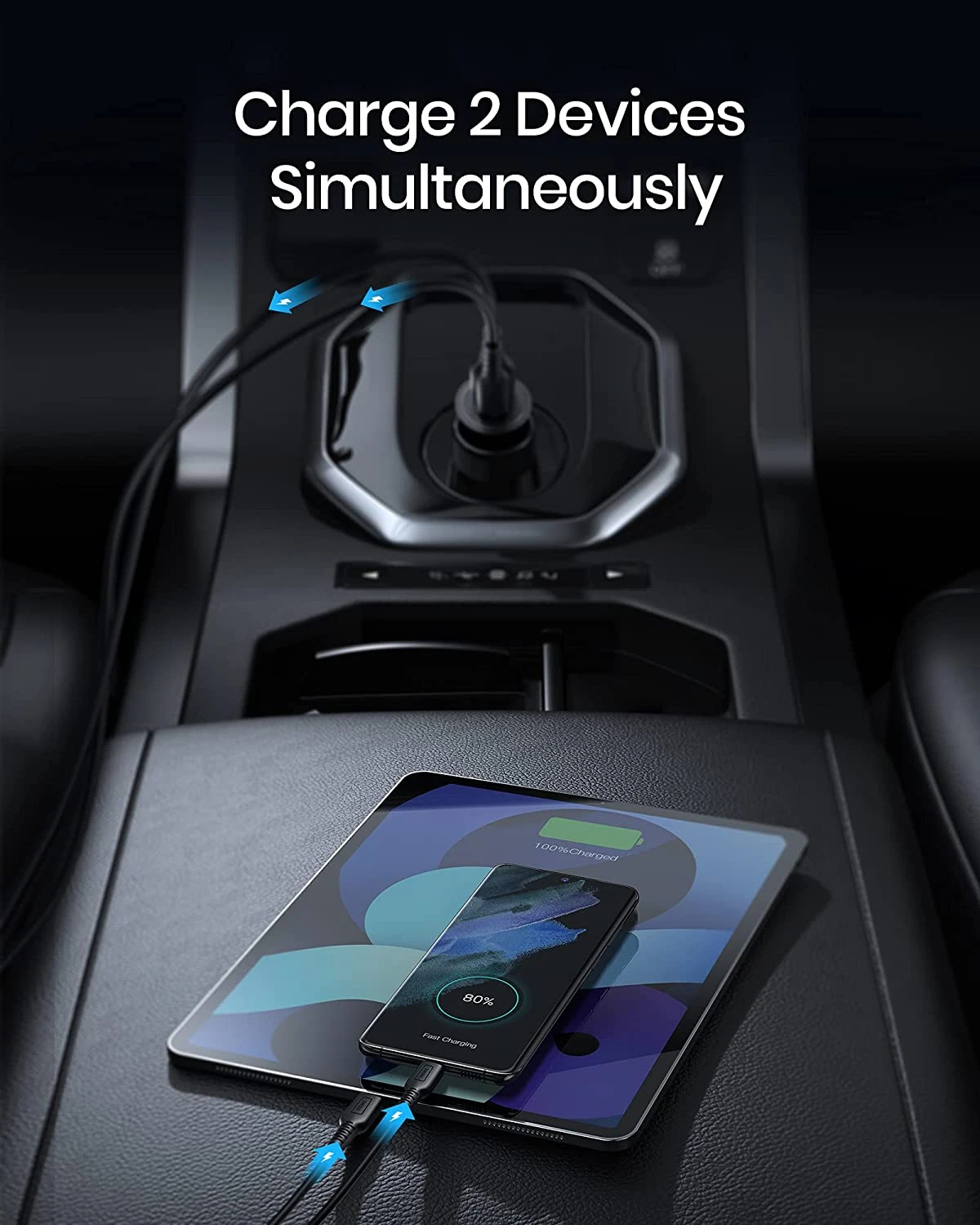 Notre Chargeur Allume Cigare d’une puissance totale de 60 Watts (2 x 30W) est l’un des plus puissants du marché. Il peut recharger deux appareils ultra rapidement et recharge généralement un smartphone de 0% à 80% en seulement 30 minutes 🔥.