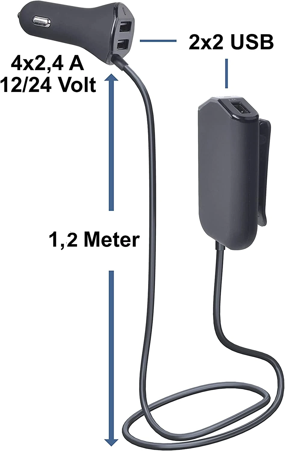 Notre Chargeur pour voiture de la marque Girafus de 24 Volts recharge jusqu’à 4 smartphones en même temps afin de permettre à tous les passagers d’en profiter (le câble de 1 mètre 20 est fourni) ❤️.
