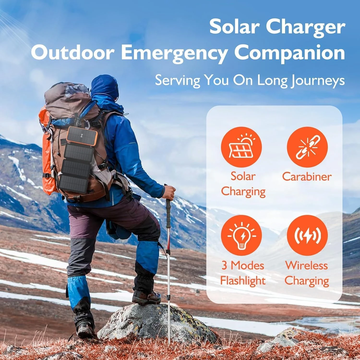 Ce chargeur est aussi équipé de 3 lampes de poche LED ultra-lumineuses avec 4 modes d’éclairage (lumière forte, douce, SOS, clignotant). Une fonctionnalité indispensable pour les activités de plein air comme le camping, ou encore en cas de panne de courant. Le mousqueton inclus permet de l’accrocher facilement à votre sac à dos pour profiter de la recharge solaire en chemin.