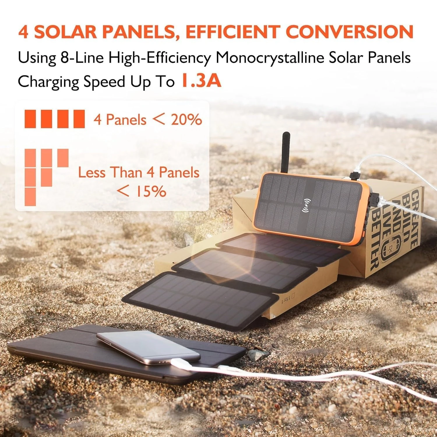 Doté de 4 panneaux solaires pliables à haute efficacité, ce chargeur convertit rapidement la lumière solaire en énergie avec une puissance de 7W et un courant de 1.3A. Bien que la charge solaire soit destinée à un usage d’urgence, elle est parfaite pour les situations où vous êtes loin d’une source d’alimentation électrique.