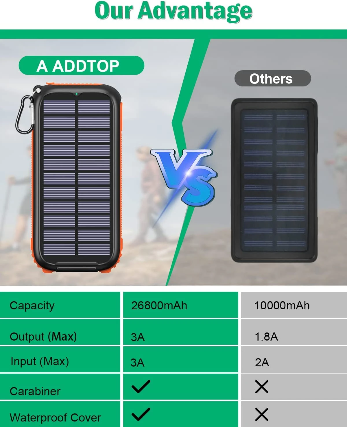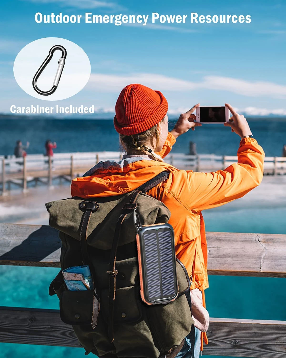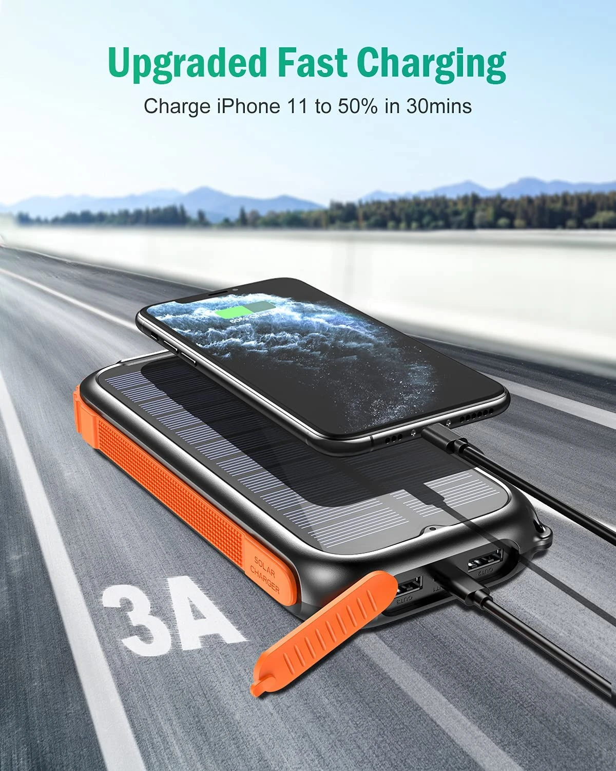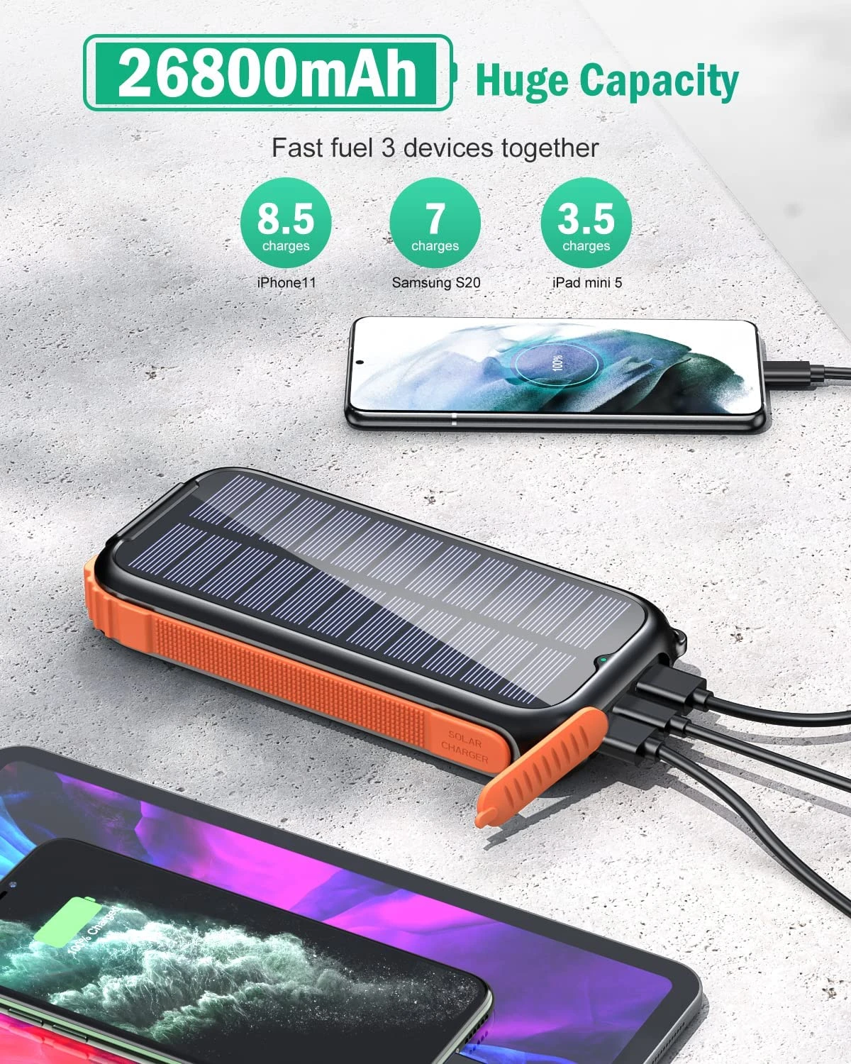 Avec sa batterie intégrée de 26 800 mAh, notre chargeur solaire peut recharger des appareils comme le Galaxy S20 jusqu’à 6 fois et alimenter d’autres appareils USB plusieurs fois. Il fournit jusqu’à une semaine d’autonomie, parfait pour les longues escapades sans source d’électricité.