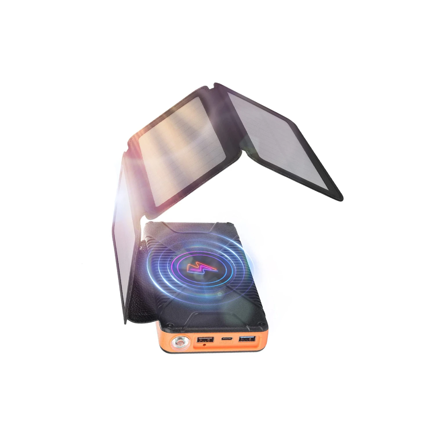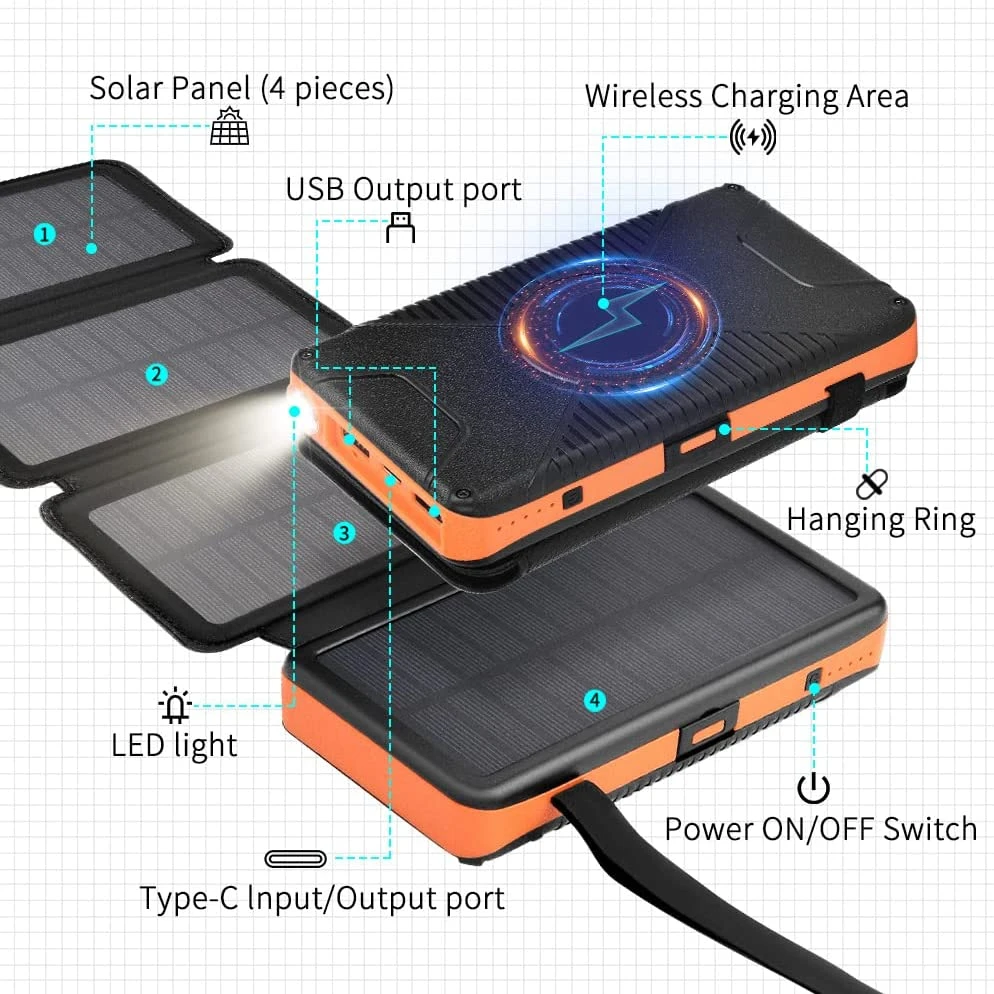 Notre Batterie Mobile Solaire dispose au total de 4 panneaux solaires lui permettant de récupérer l’énergie solaire à grande vitesse et d’un port USB Type-C lui permettant d’être rechargée de manière filaire via adaptateur secteur encore plus rapidement 💖.