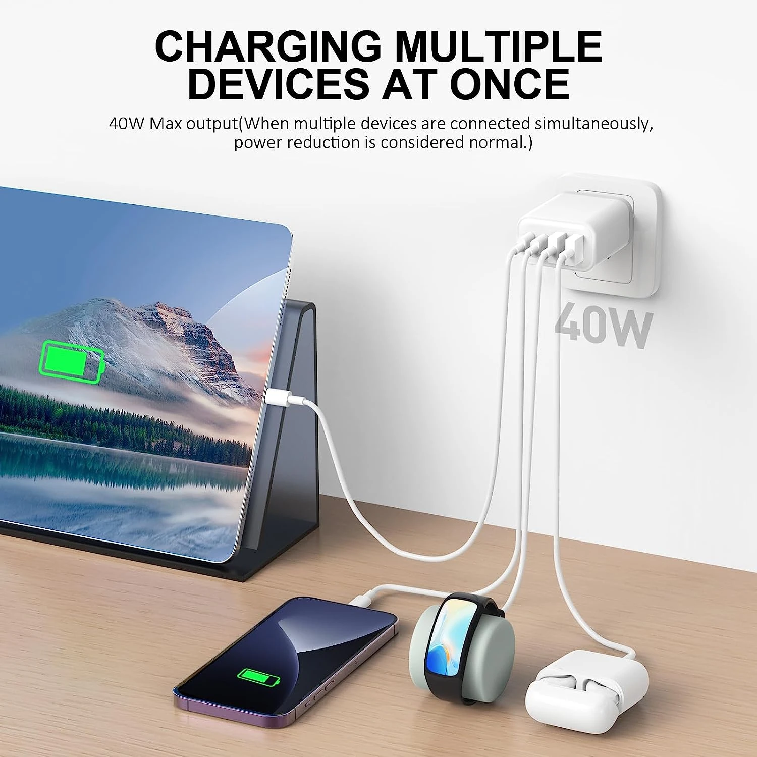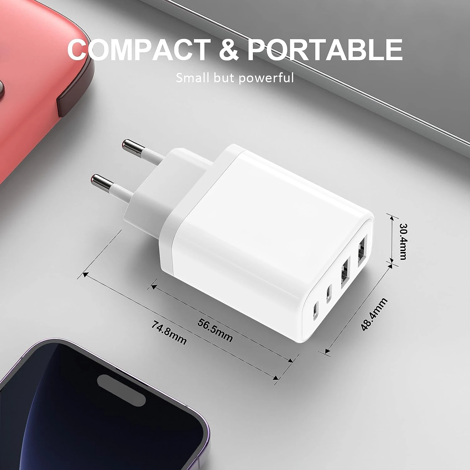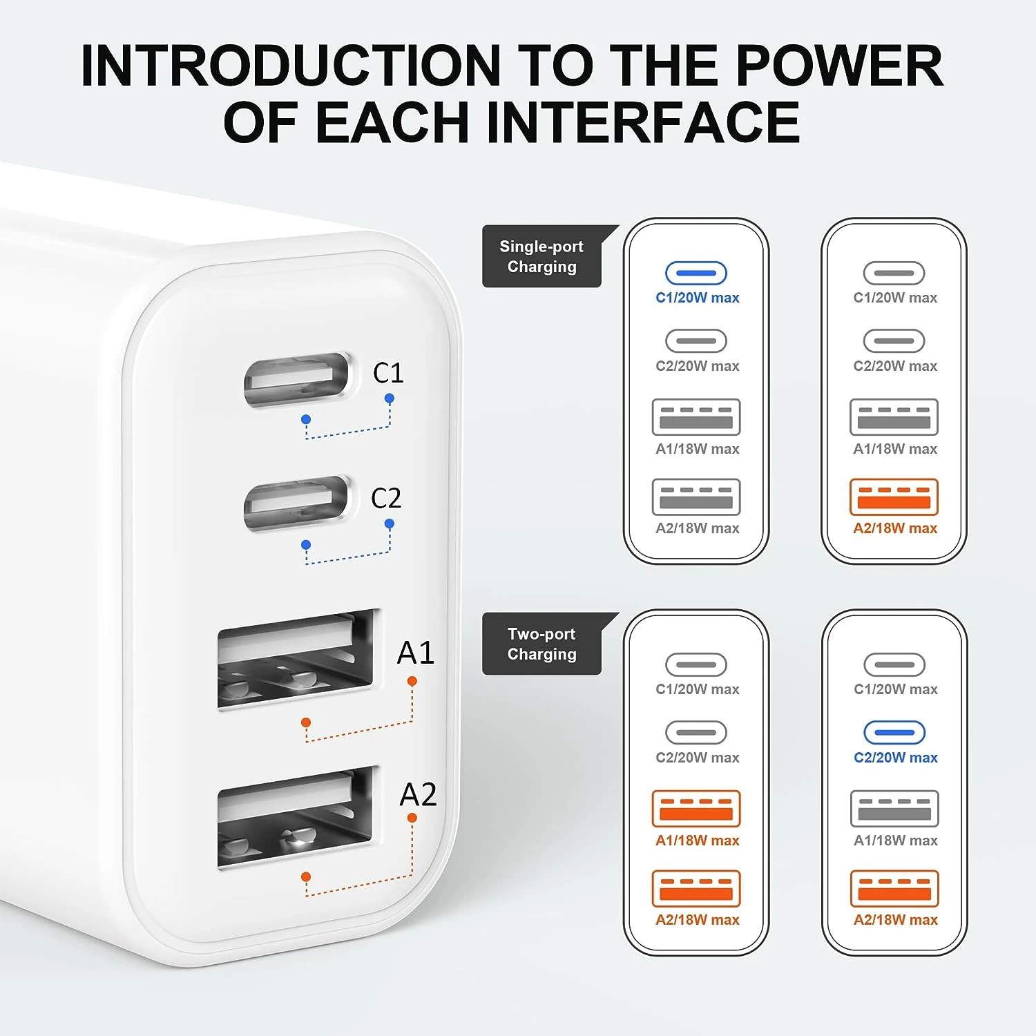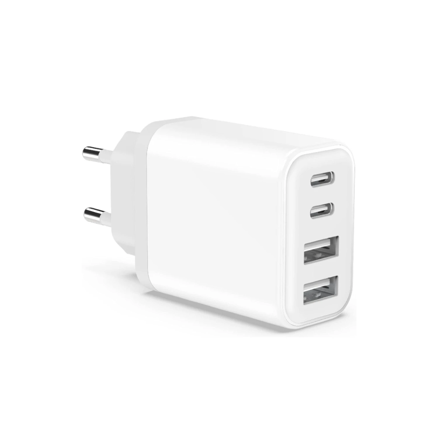 Avec ses deux ports USB-A et deux ports USB-C, ce chargeur vous permet de connecter jusqu’à quatre appareils en même temps. Le port USB-C offre une puissance de sortie rapide de 20W, idéale pour vos smartphones et tablettes, tandis que le port USB-A fournit 3A/5V, s’adaptant parfaitement à vos autres appareils.