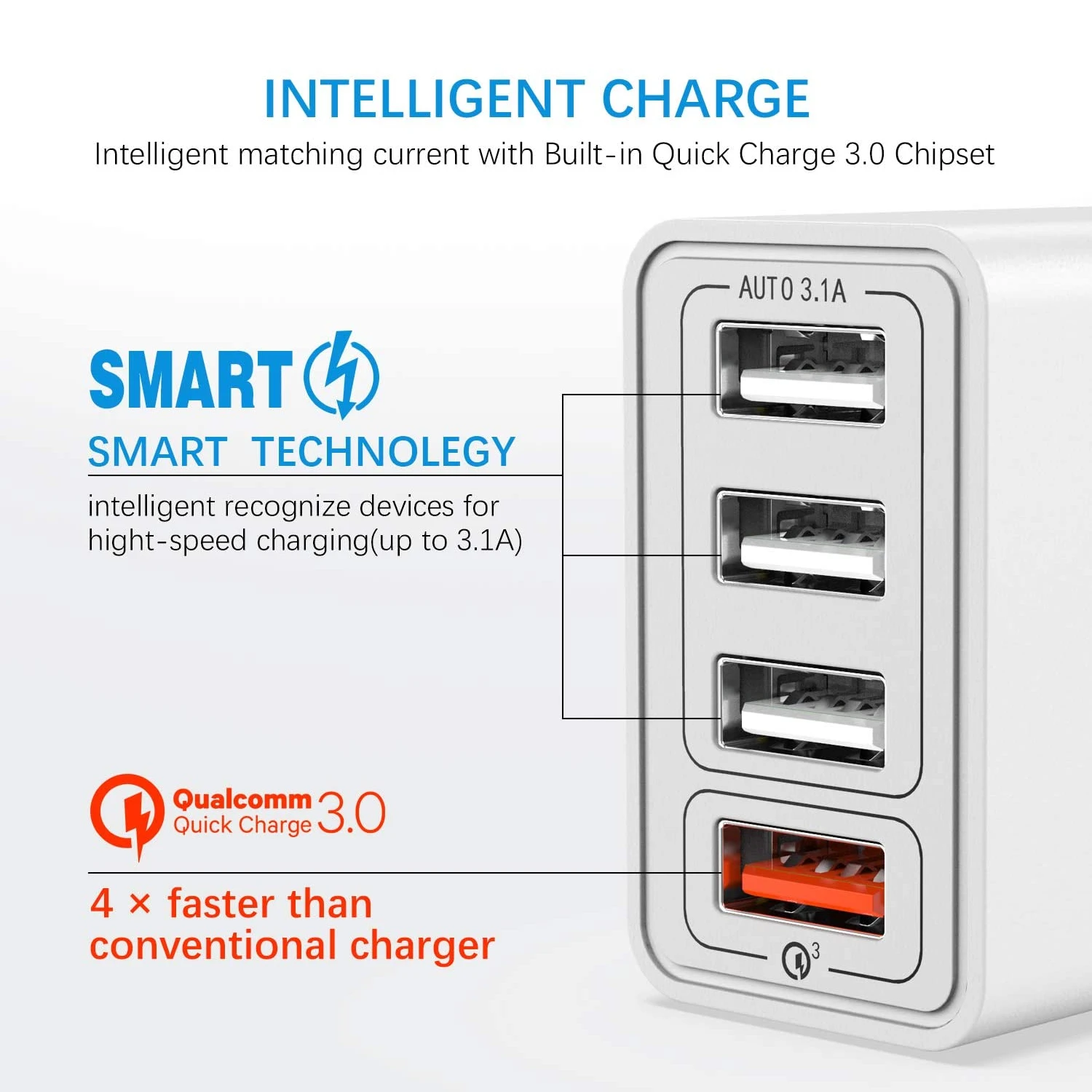 Avec ses 4 ports USB, dont un Quick Charge 3.0 de 30W et trois ports 3.1A, vous pouvez recharger simultanément plusieurs appareils à pleine vitesse. La puce intelligente intégrée détecte vos appareils pour offrir une charge optimale et sécurisée.