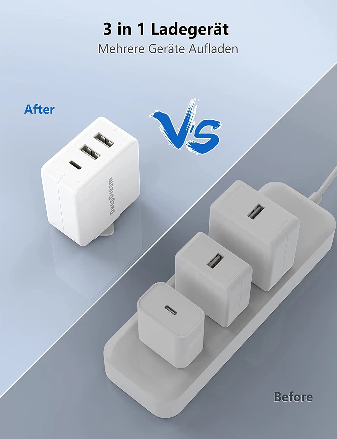 Équipé de trois ports (un port USB-C et deux ports USB-A), ce chargeur offre une puissance totale de 32 W, permettant de recharger trois appareils en même temps. Plus besoin de transporter plusieurs chargeurs lors de vos voyages ou au bureau.