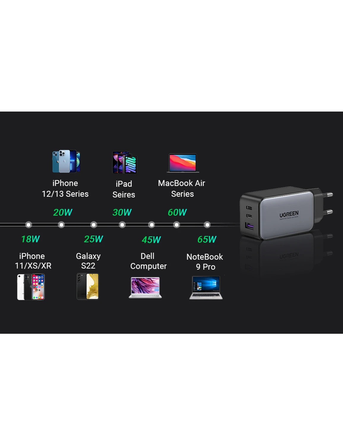 Grâce à sa puissance maximale de 65W, notre chargeur est capable d’alimenter une large gamme de dispositifs, des smartphones aux ordinateurs portables comme le MacBook. Il est compatible avec plusieurs protocoles de charge rapide, dont Samsung Adaptive Fast Charge, Huawei FCP, USB PD, et Quick Charge Qualcomm.