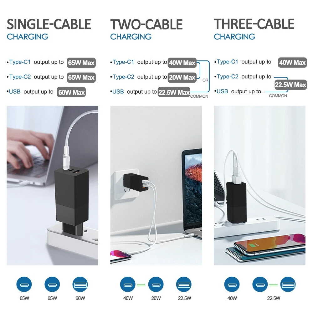 Adaptateur Secteur Rapide de 65W avec 3 Ports