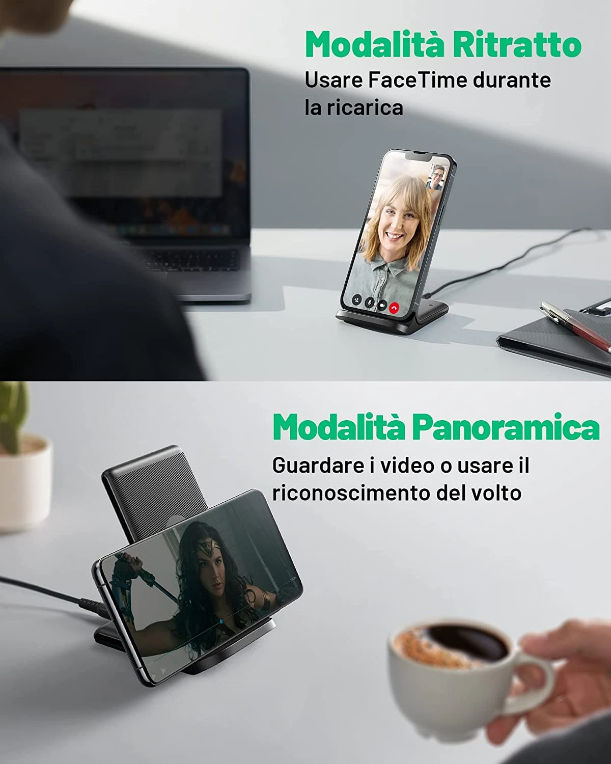 L’indicateur LED de notre chargeur est auto-adaptant, il s’ajuste automatiquement pour être plus lumineux le jour et s’atténue la nuit afin de ne pas perturber votre sommeil. La station de charge permet un usage en position horizontale ou verticale, idéale pour regarder des vidéos, consulter des recettes ou utiliser FaceTime tout en rechargeant.