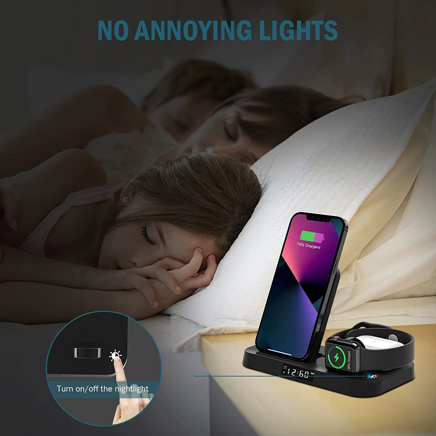 L’une des caractéristiques uniques de cette station de charge est son écran d’affichage numérique, qui indique l’heure et offre une fonction de réveil. Vous pouvez ajuster la luminosité sur trois niveaux pour un confort optimal pendant la nuit. De plus, l’indicateur LED peut être éteint manuellement, garantissant une expérience de sommeil sans distractions.
