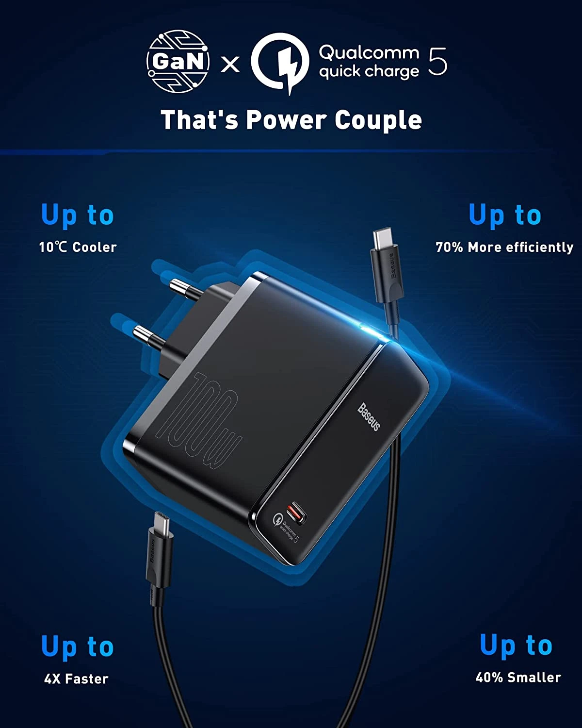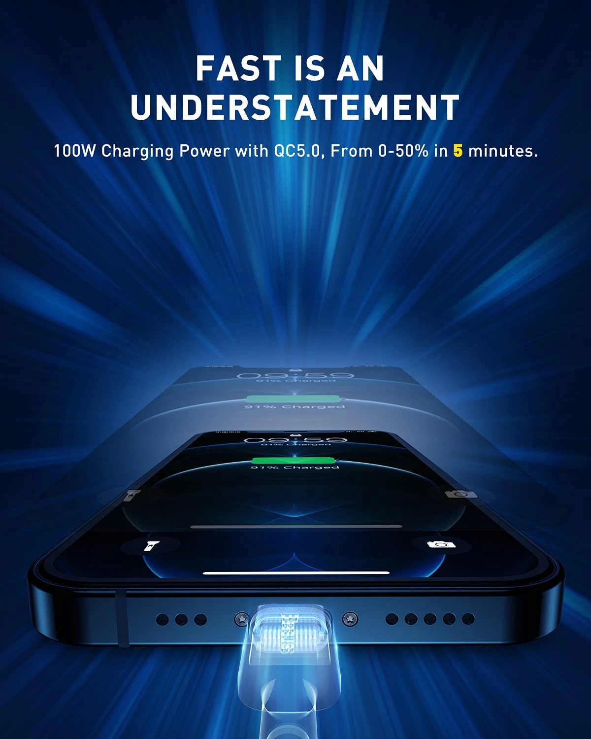 Grâce à sa puissance de 100 W, notre chargeur peut recharger un MacBook Pro 13’’ en seulement 2 heures ou amener votre iPhone 11 à 50 % en 30 minutes. Compatible avec les protocoles QC5, QC4.0+, PD3.0 et PPS, il s’adapte parfaitement à une large gamme d’appareils.
