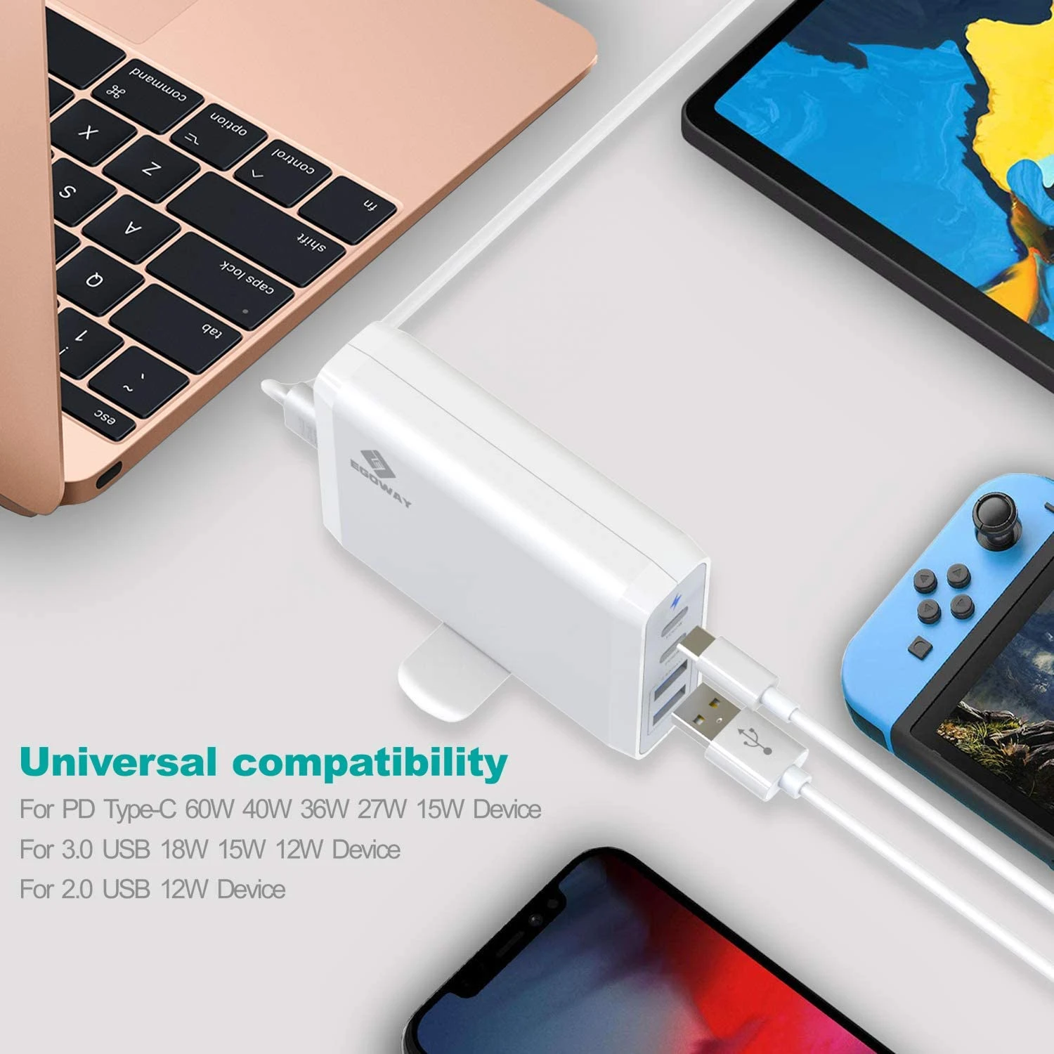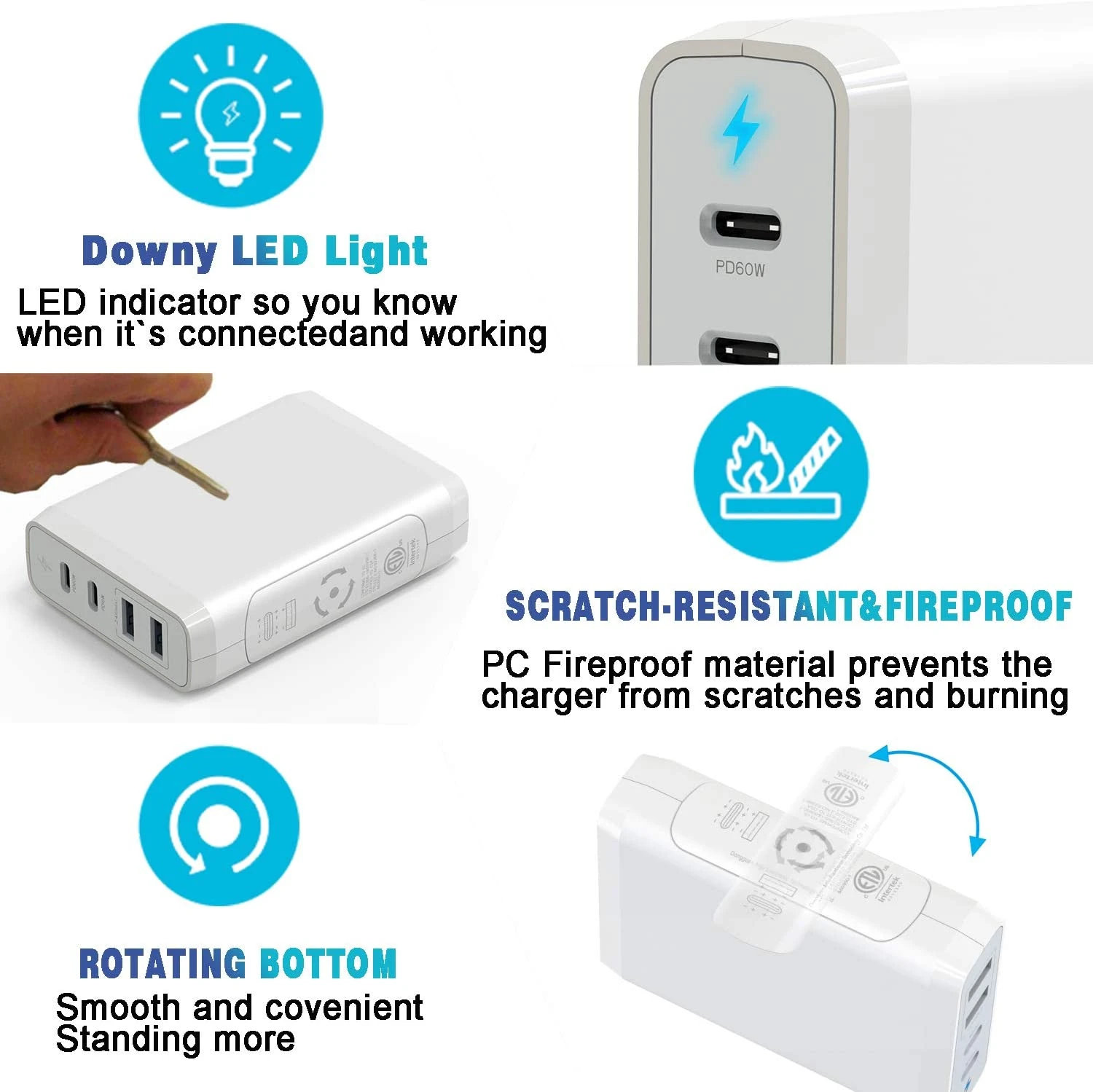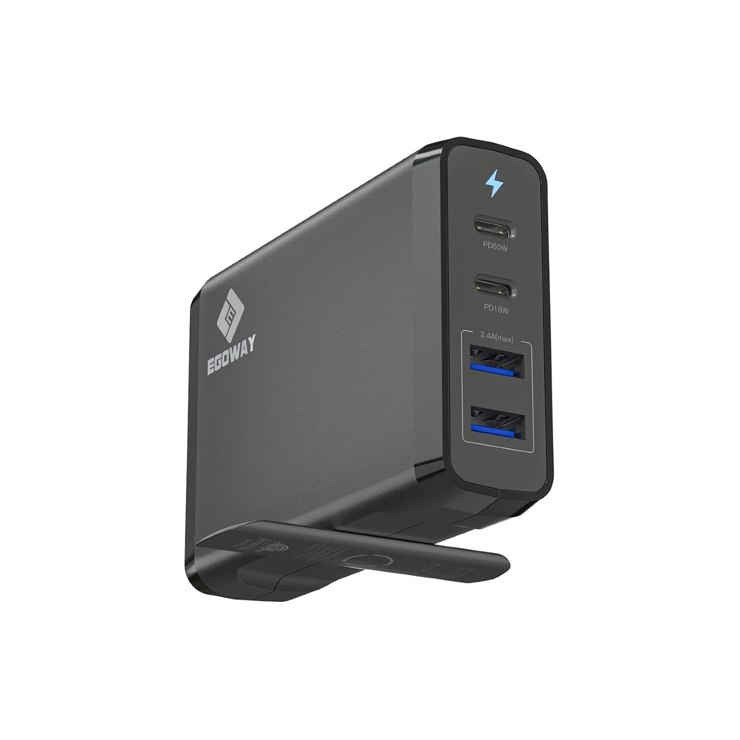 Notre Chargeur Rapide d’une puissance de 60 Watts maximum dispose de 4 ports USB permettant de recharger jusqu’à 4 appareils à la fois : 2 Ports USB Type-C dont un de 60 Watts et un autre de 18 Watts et 2 ports USB-A de 2,4A ❤️.