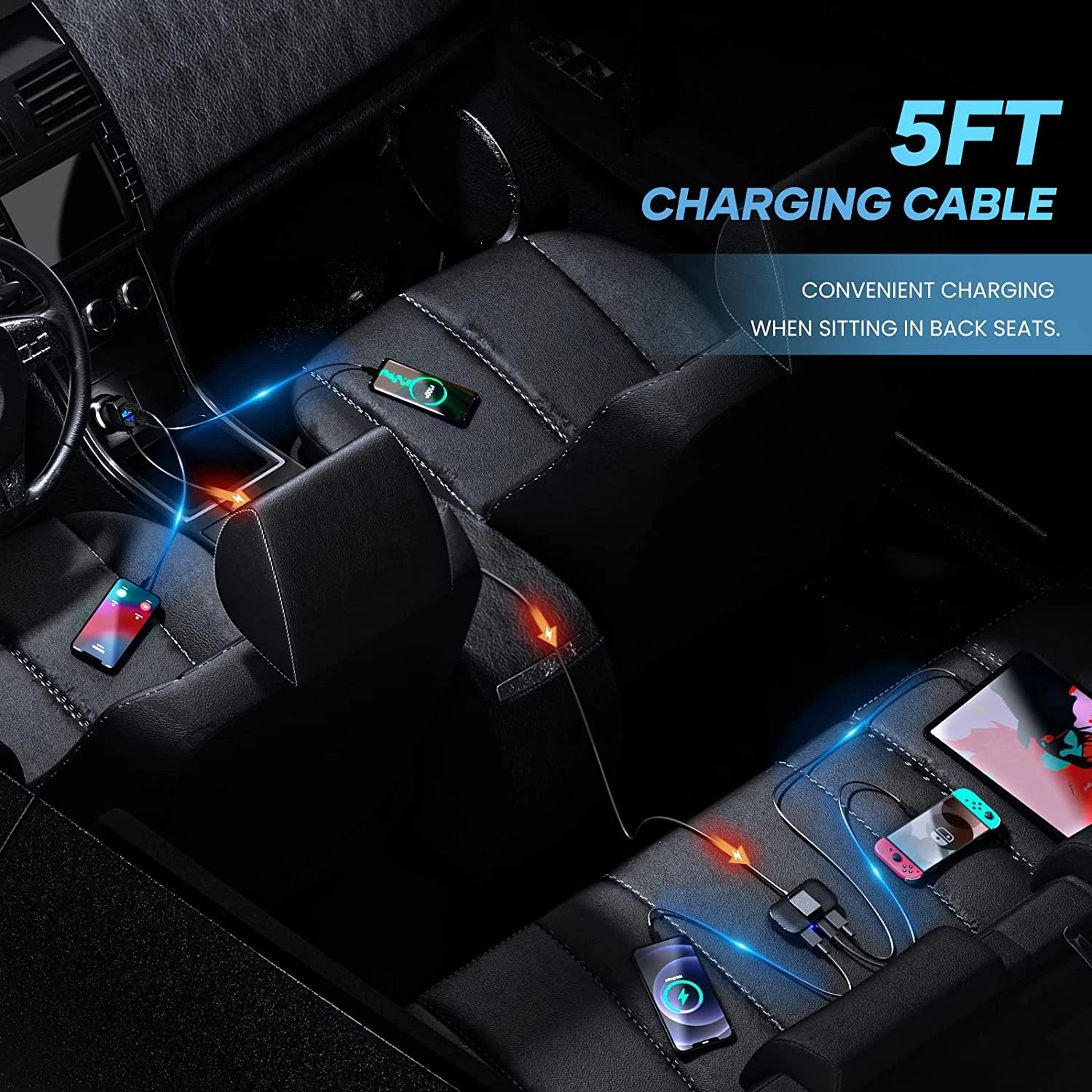 Notre Chargeur pour voiture dispose au total de 5 ports USB (3 USB-A et 2 USB-C), son support externe est équipé d’une pince clipsable à l’arrière afin de faciliter la charge aux passagers du trajet ❤️.