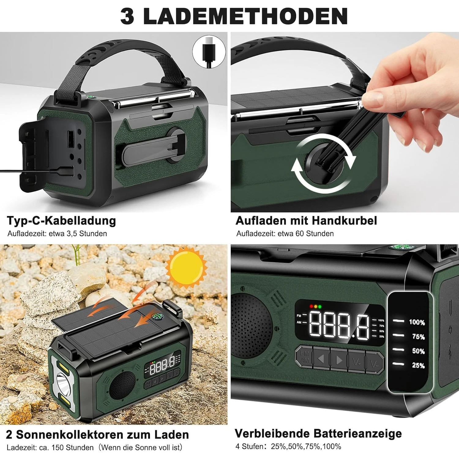 Avec ses trois modes de charge, cette radio offre une solution énergétique complète : charge solaire, charge C, et charge à manivelle. Les deux grands panneaux solaires assurent une efficacité et une vitesse de chargement supérieures. -