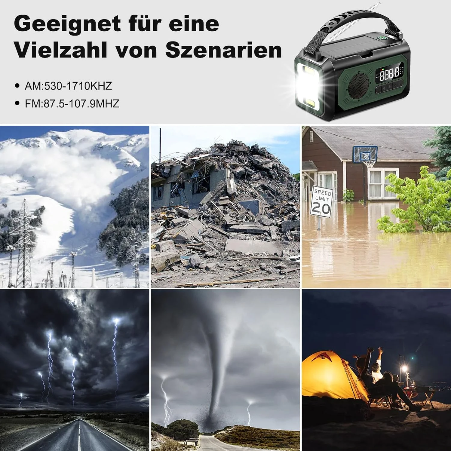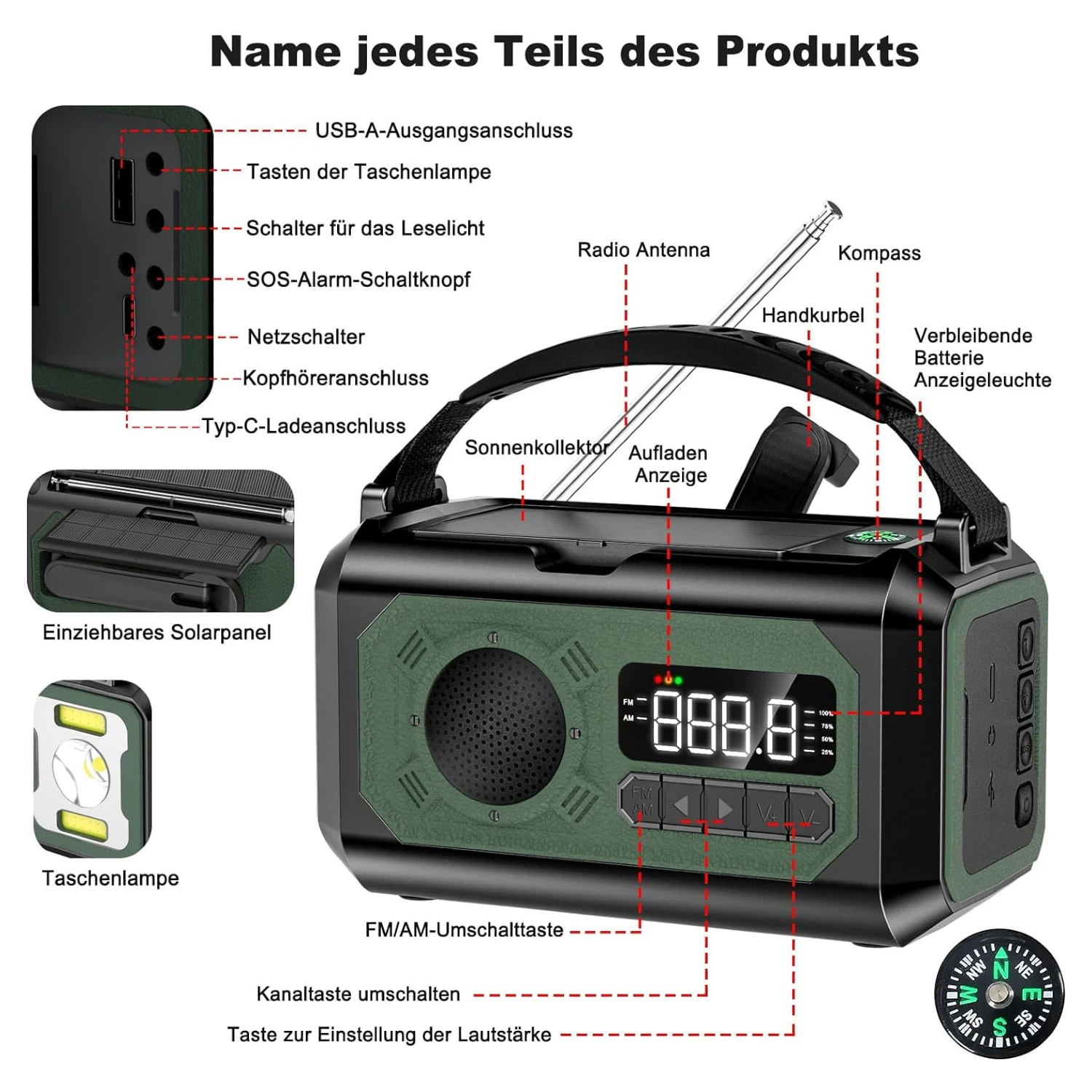 Cette radio offre un éventail de fonctionnalités, de la lampe de poche à la fonction d’alarme SOS puissante, en passant par la radio AM/FM et un compas intégré, vous permettant de rester informé et préparé en toutes circonstances. -