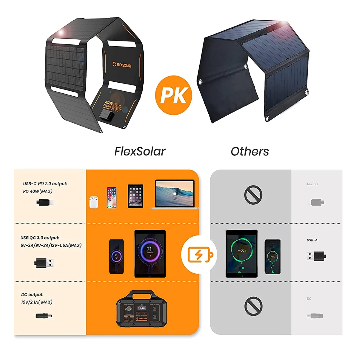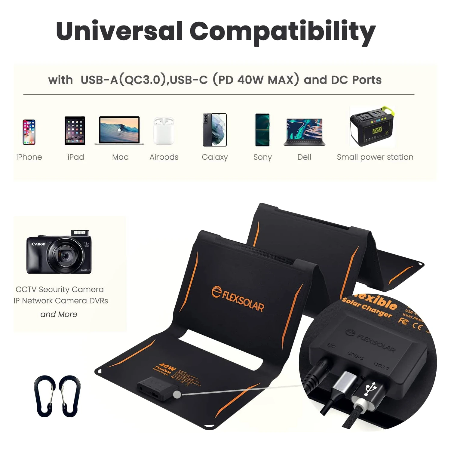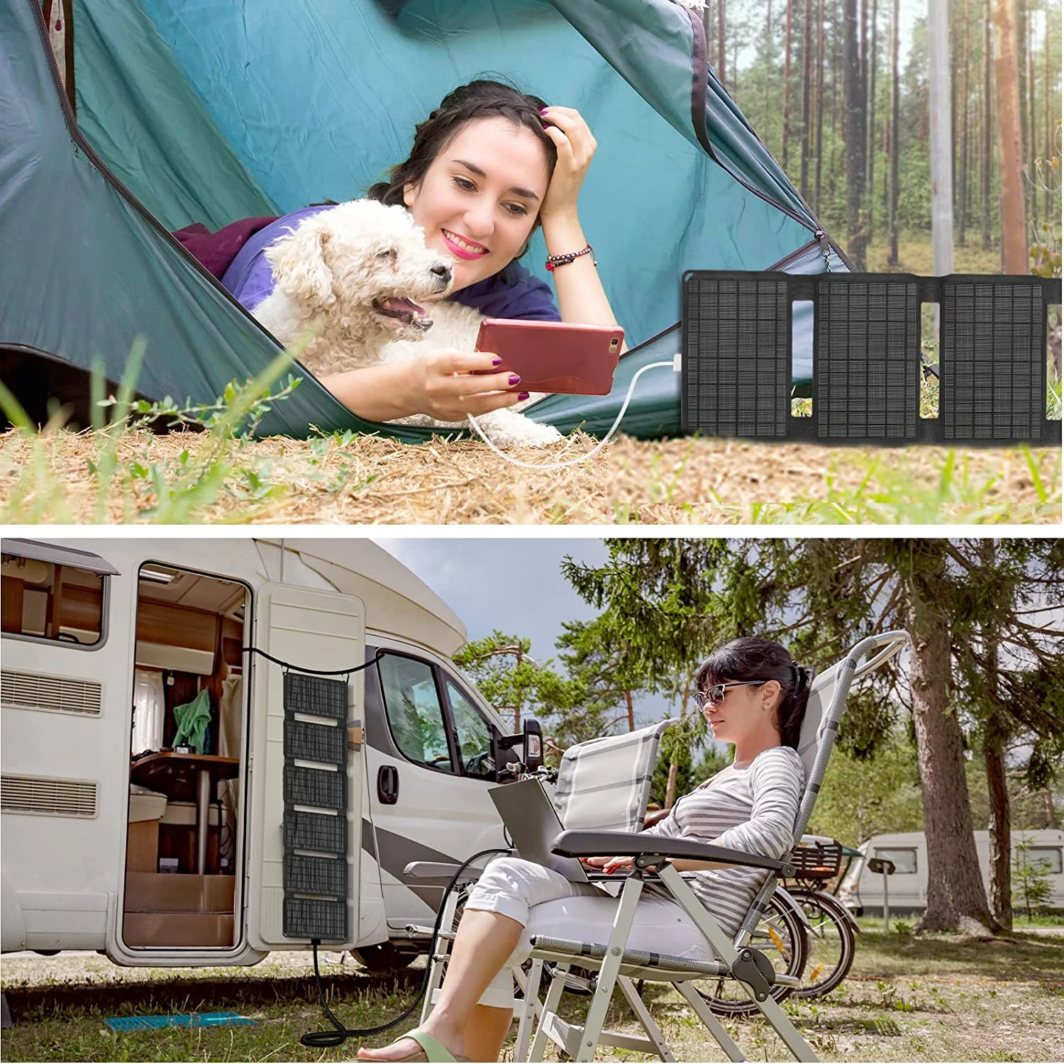 Notre Chargeur Solaire a puissance de 40 watts et une tension allant jusqu’à 19V (19 volts) lui permettant de recharger divers appareils tels qu’un smartphone, une tablette, des AirPods (ou autres écouteurs sans fil), un ordinateur portable ou encore un générateur portable électrique 🌞.