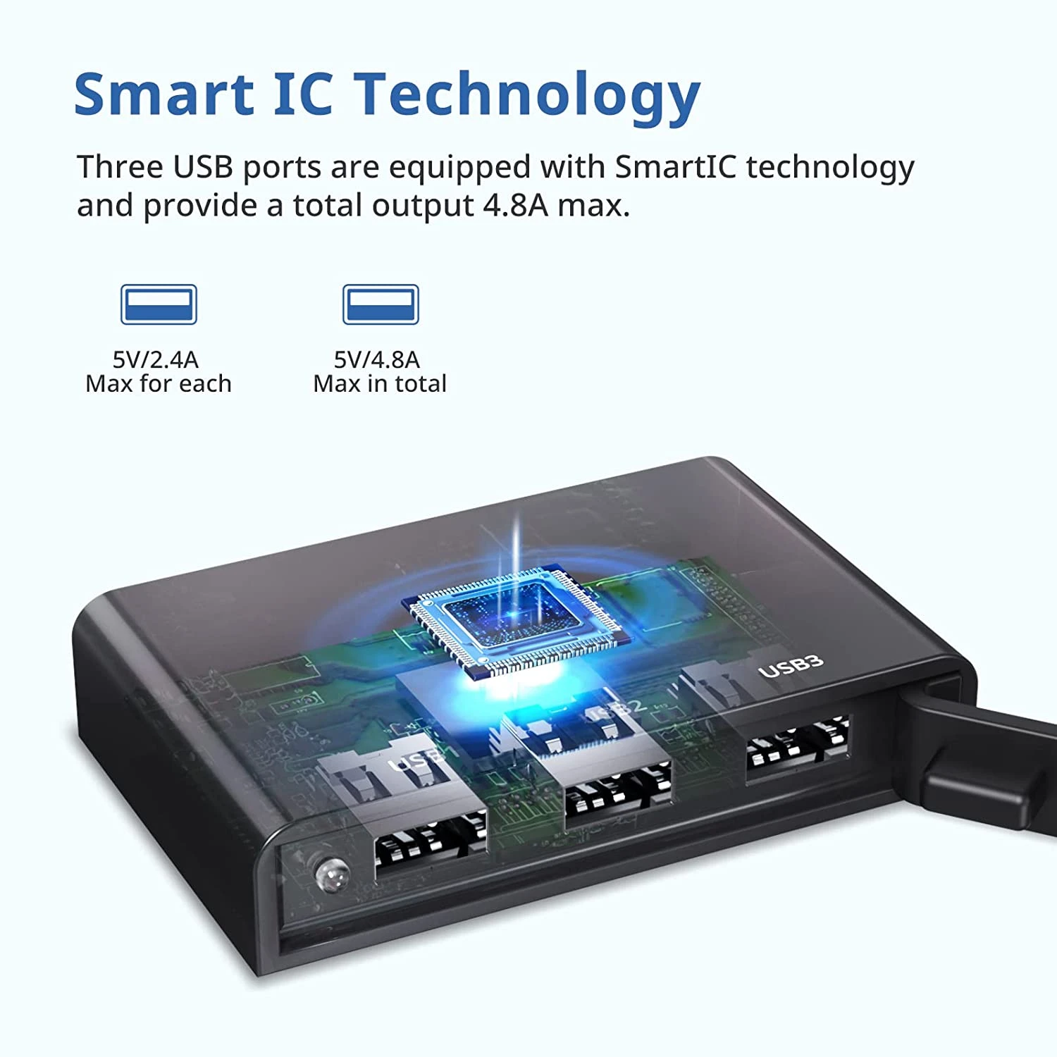 Ses 3 ports USB permettent de recharger 3 appareils (smartphone, tablette, batterie externe,…) en même temps.