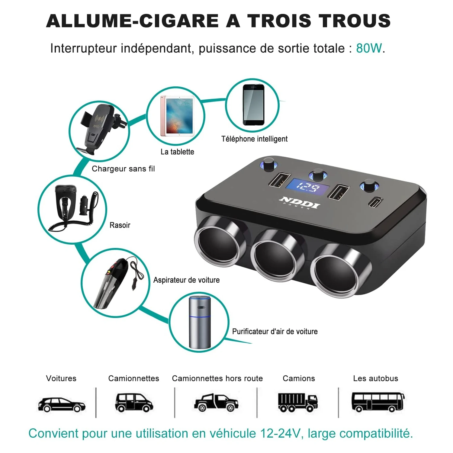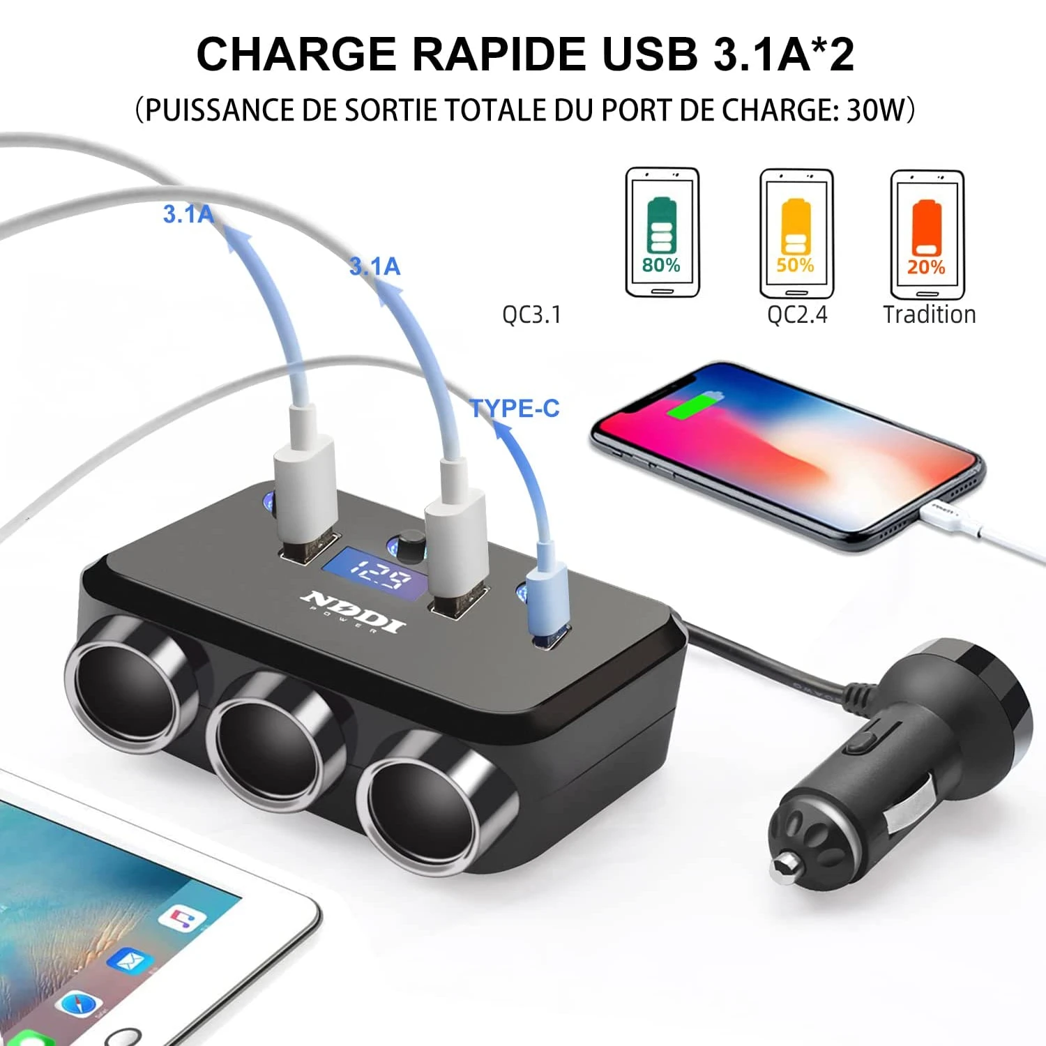 Notre Chargeur Allume Cigare de la marque NDDI Power détiens 3 séparateurs allume-cigare de 12 volts et 3 ports USB-A classique accordant une utilisation variée et complète à tous les passagers de la voiture ❤️.