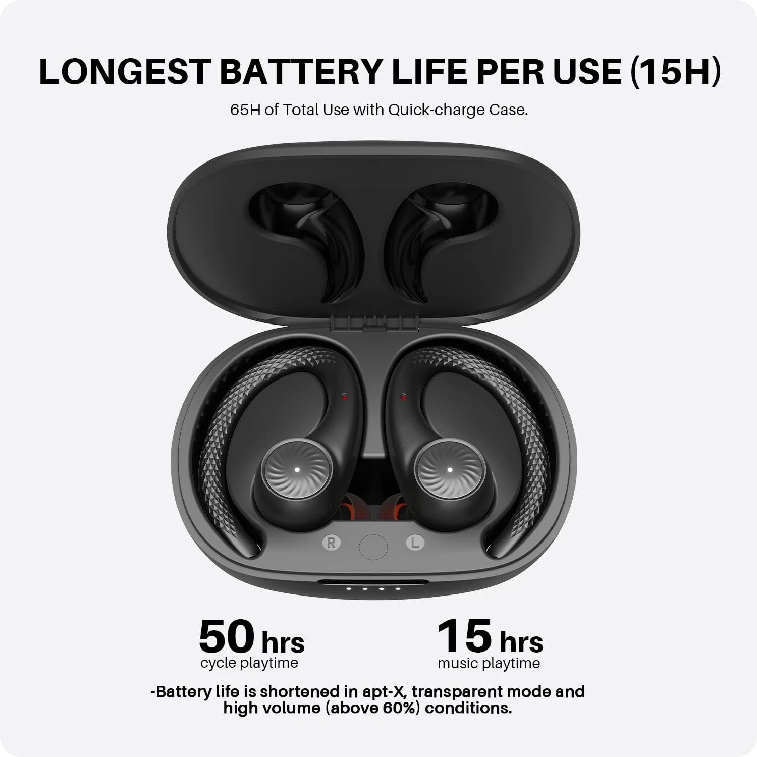 Longue Durée de Lecture de 65 Heures 🎶 : Profitez de jusqu’à 15 heures d’écoute continue avec ces écouteurs de sport sans fil, et jusqu’à 65 heures avec l’étui de chargement rapide. Idéaux pour les entraînements de longue durée sans interruption.