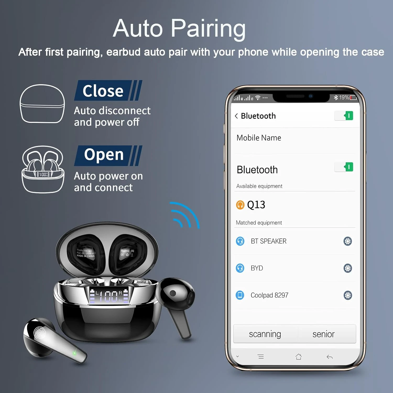 Bluetooth 5.3 et Couplage en une Étape 📶: Ces écouteurs sans fil intègrent la toute dernière technologie Bluetooth 5.3, offrant une connectivité sans faille avec une portée allant jusqu’à 15 mètres. Ils se connectent automatiquement dès leur sortie de l’étui de chargement, garantissant une expérience fluide, que vous écoutiez de la musique ou regardiez des films.