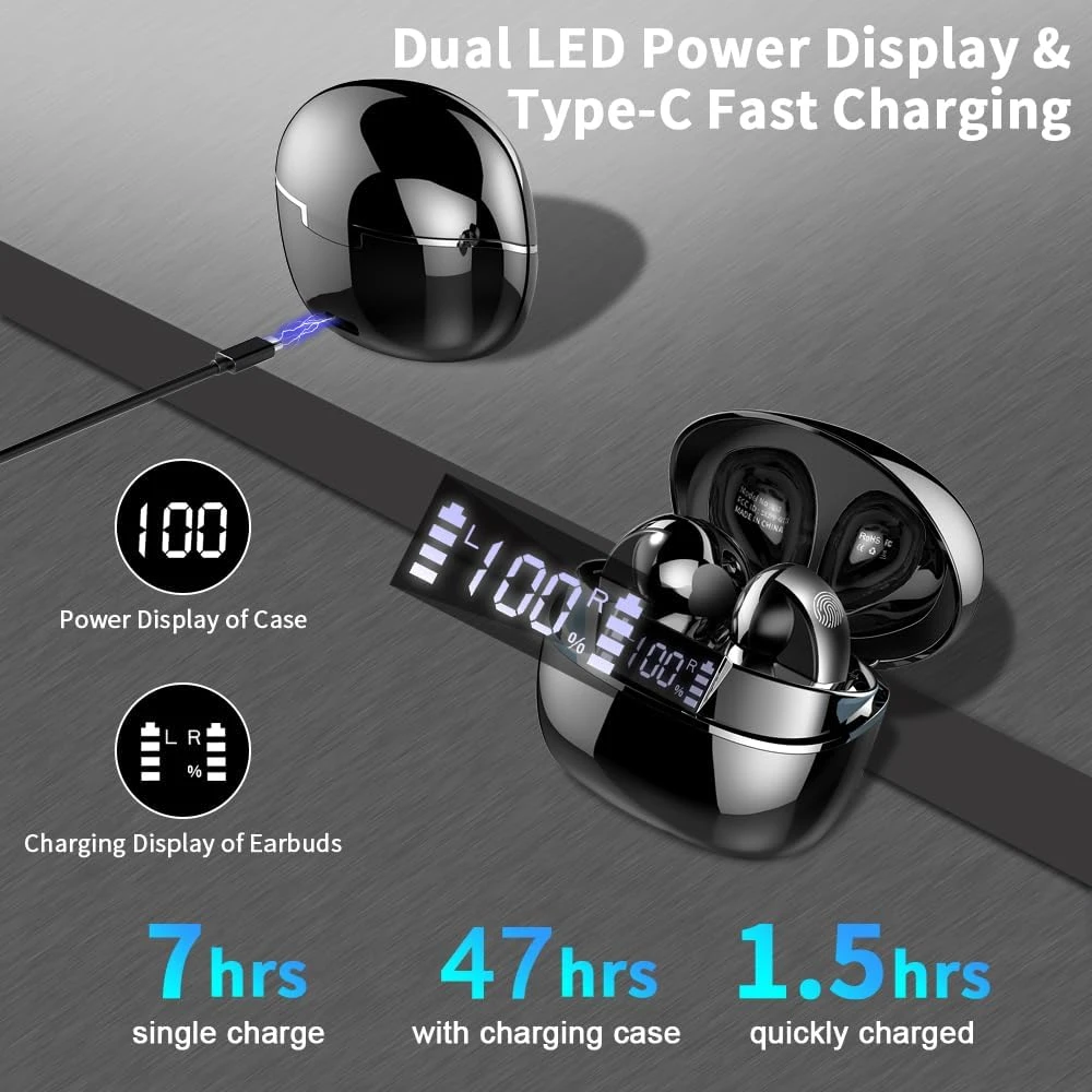 47 Heures de Lecture et Double Affichage LED 🔋 : Profitez d’une autonomie exceptionnelle avec un total de 47 heures d’utilisation. Une charge de seulement 1,5 heure offre 7 heures d’écoute, et l’étui de chargement portable peut recharger les écouteurs 6 à 8 fois. L’affichage LED sur l’étui vous permet de suivre en temps réel le niveau de la batterie des écouteurs et de l’étui.