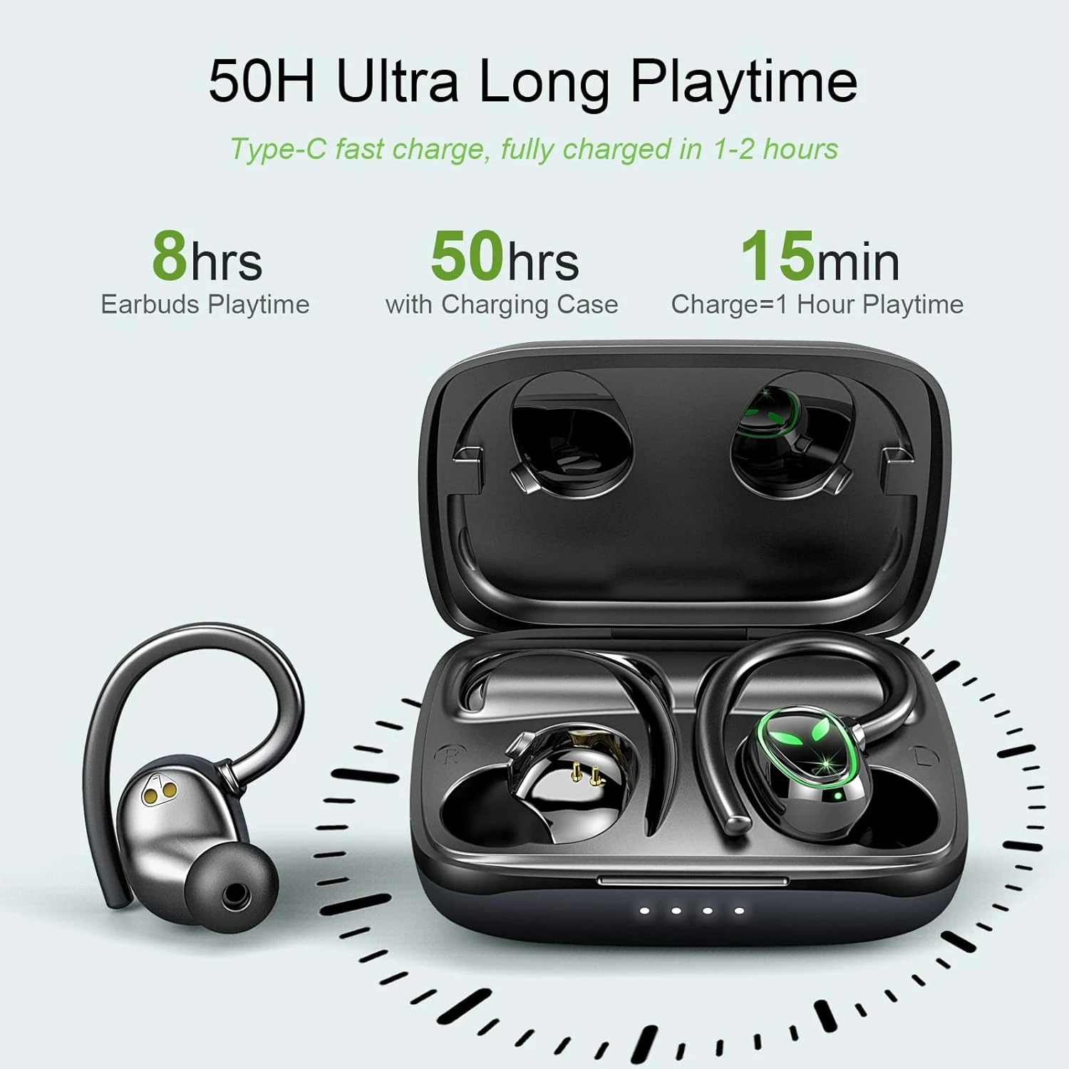 50 Heures de Temps de Lecture et Charge Rapide 🔋 : Grâce à la puce Bluetooth 5.3 à faible consommation d’énergie, nos écouteurs offrent 8-10 heures de lecture ininterrompue. L’étui de charge, qui se recharge rapidement via le câble Type-C fourni, peut recharger les écouteurs 5-6 fois, offrant une autonomie totale de 50 heures. De plus, une charge complète ne prend que 1,5 heure.