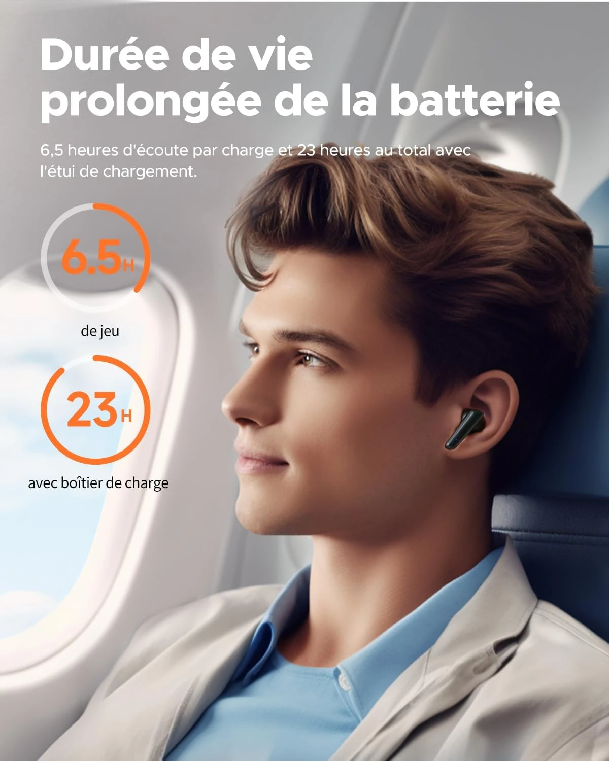 🔋 Autonomie Exceptionnelle : Nos écouteurs offrent jusqu’à 6,5 heures d’écoute sur une seule charge, et l’étui de chargement inclus prolonge cette autonomie à plus de 23 heures. Vous pouvez également utiliser un écouteur à la fois pour prolonger l’écoute jusqu’à 46 heures en alternant entre les deux. Plus de soucis concernant la durée de vie de la batterie.
