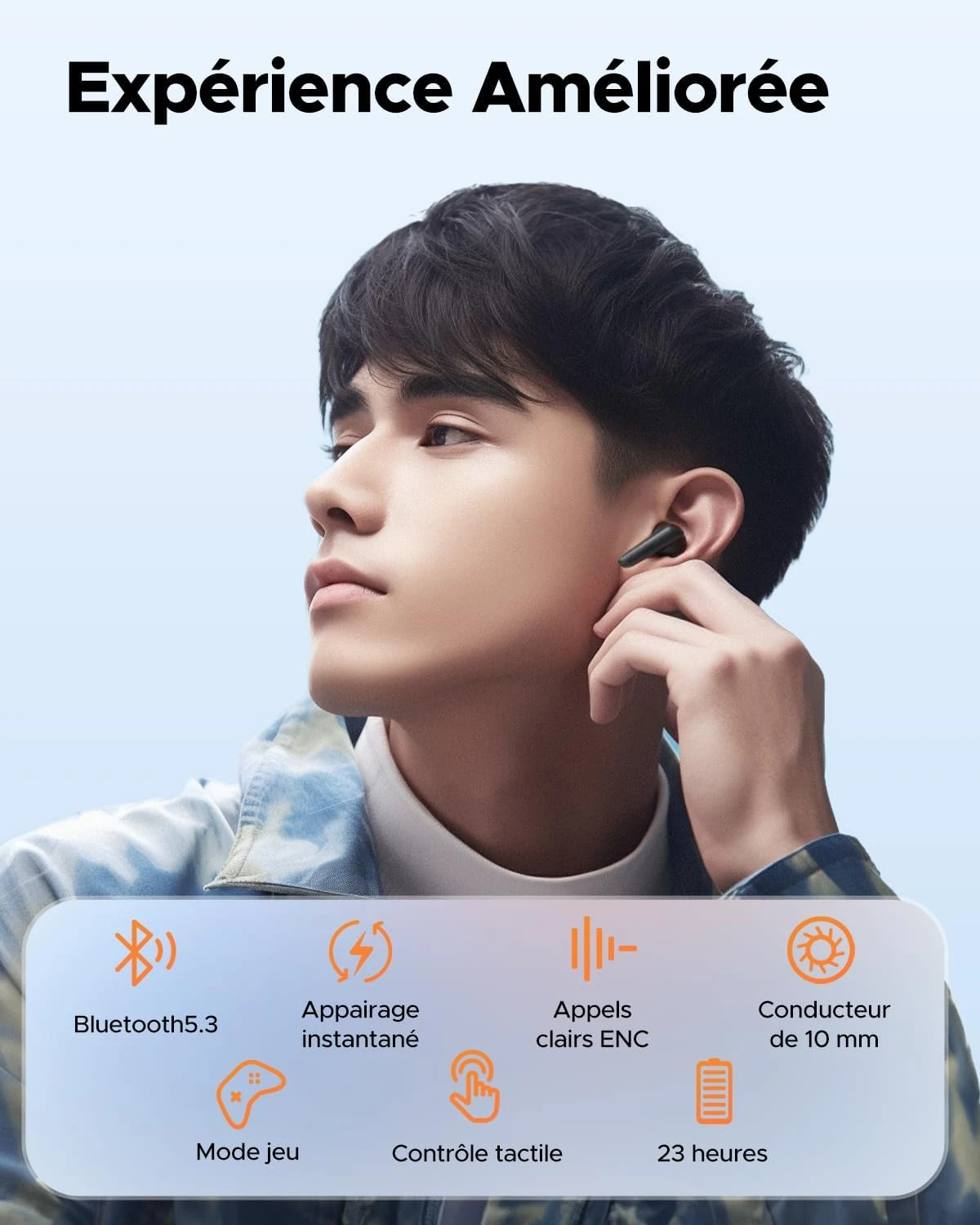 🎙️ Suppression du Bruit et Qualité Audio Exceptionnelle : Grâce à 4 microphones et à l’algorithme AI ENC, nos écouteurs capturent précisément votre voix tout en réduisant le bruit ambiant. Participez à des conférences téléphoniques, des cours en ligne, des discussions vidéo, des diffusions en direct, etc., avec une qualité sonore exceptionnelle.