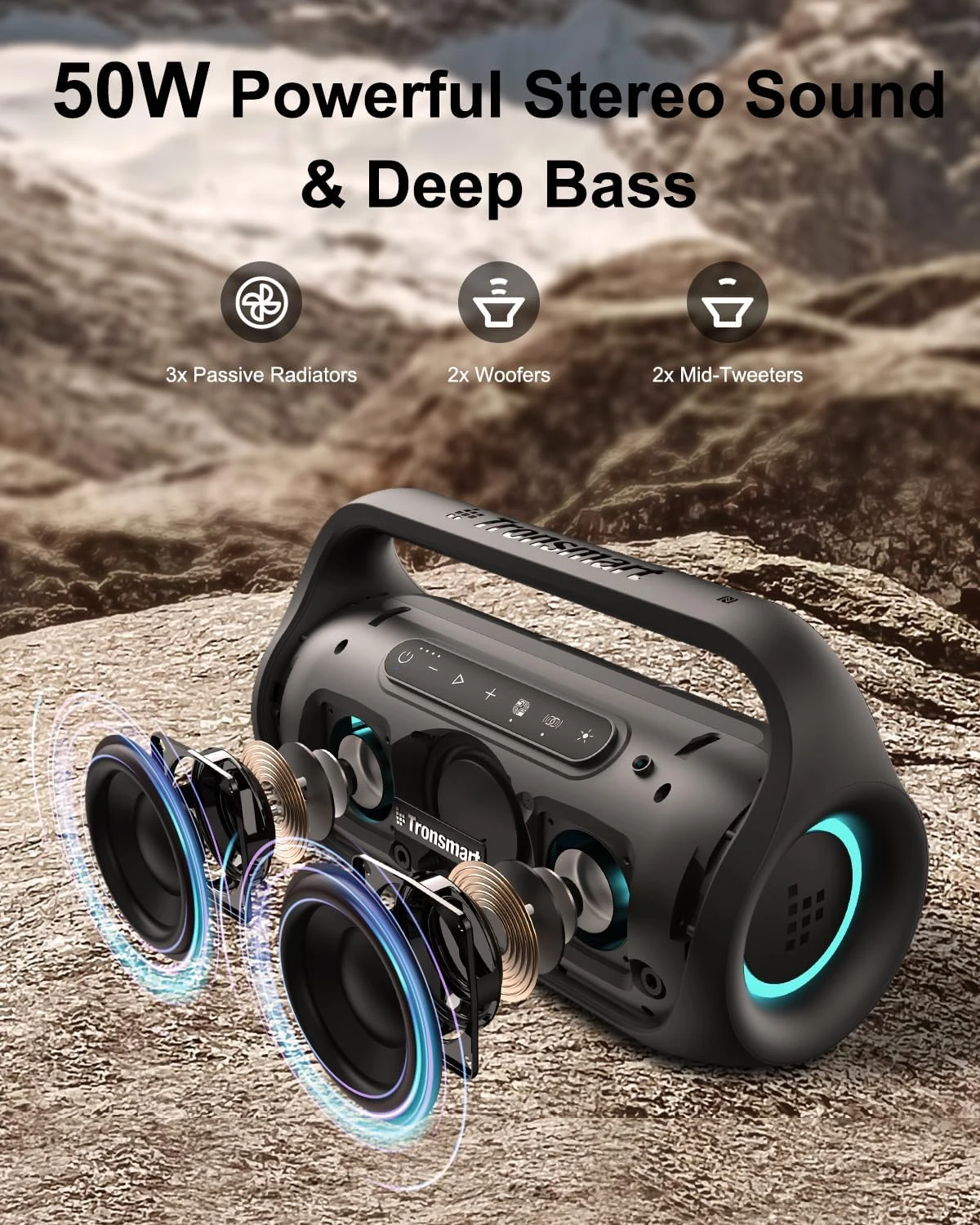 🔊 Basses puissantes et aigus cristallins : Notre enceinte Bluetooth portable Tronsmart est équipée de deux cavités indépendantes qui offrent une qualité sonore exceptionnelle. La cavité avant produit des aigus cristallins d’une clarté supérieure, tandis que la cavité arrière offre des basses puissantes. Avec un haut-parleur haute définition de 50 W, vous bénéficierez d’un volume supérieur pour animer vos réunions en intérieur et en extérieur.