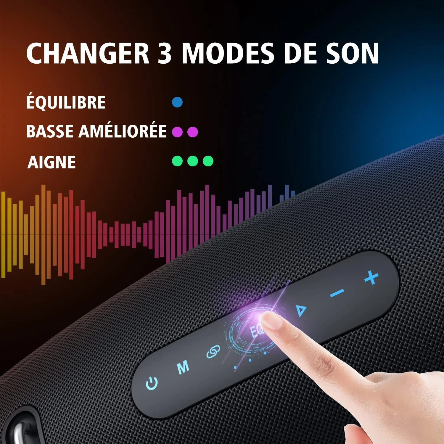 Divers effets sonores 🔊 : Notre enceinte offre une variété de modes sonores pour répondre à vos préférences d’écoute. Vous pouvez ajuster les voix pour plus de clarté ou les basses pour un effet plus explosif. Le bouton EQ vous permet de choisir parmi 3 modes sonores et de personnaliser votre expérience audio.