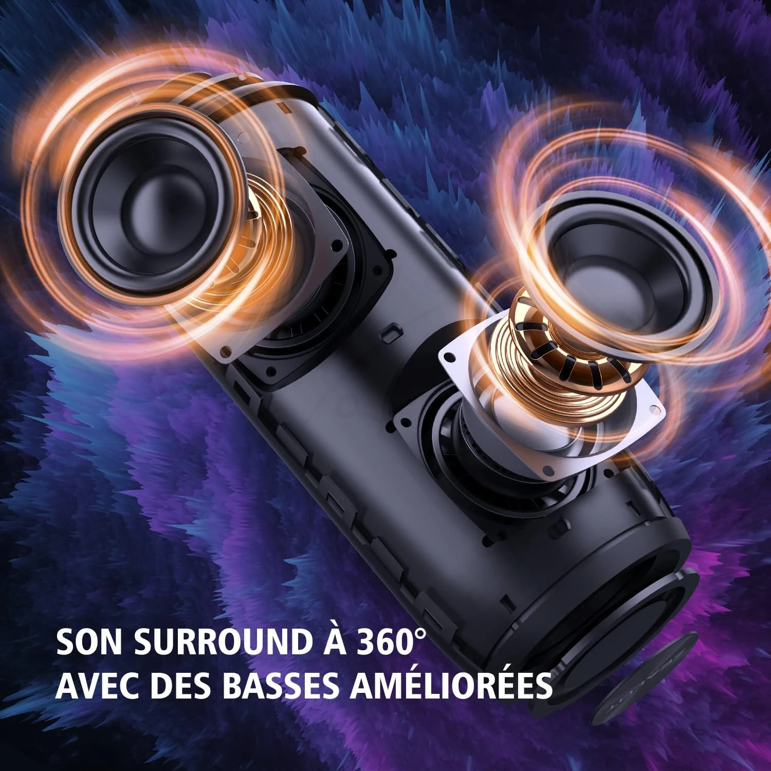 Appairage stéréo sans fil 📡 : L’enceinte est conçue avec un pilote audio stéréo de 40W, permettant une lecture à volume maximal sans distorsion. De plus, vous pouvez coupler deux enceintes S51 Pro via Bluetooth pour obtenir un son stéréo surround haute définition à 360°, vous plongeant au cœur de la musique.