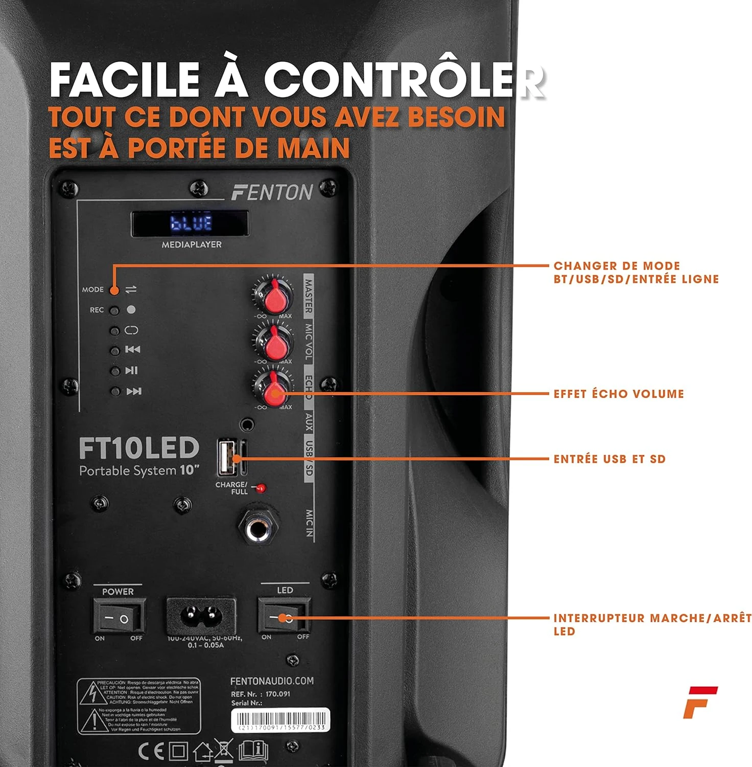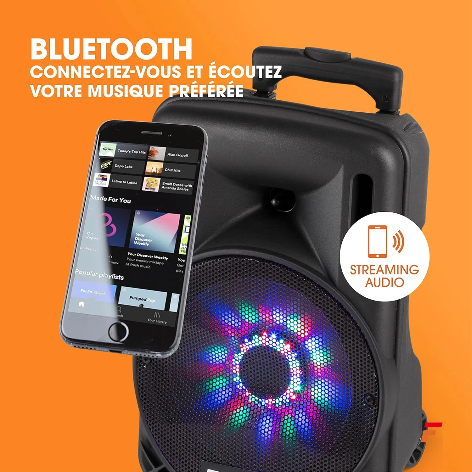 Avec éclairage LED 💡 : Cette enceinte sono est dotée d’un éclairage LED intégré qui ajoute une touche d’ambiance à votre expérience musicale. Vous pouvez choisir d’activer ou de désactiver les lumières LED à l’aide du bouton marche/arrêt, ce qui vous permet de personnaliser l’atmosphère en fonction de vos préférences.