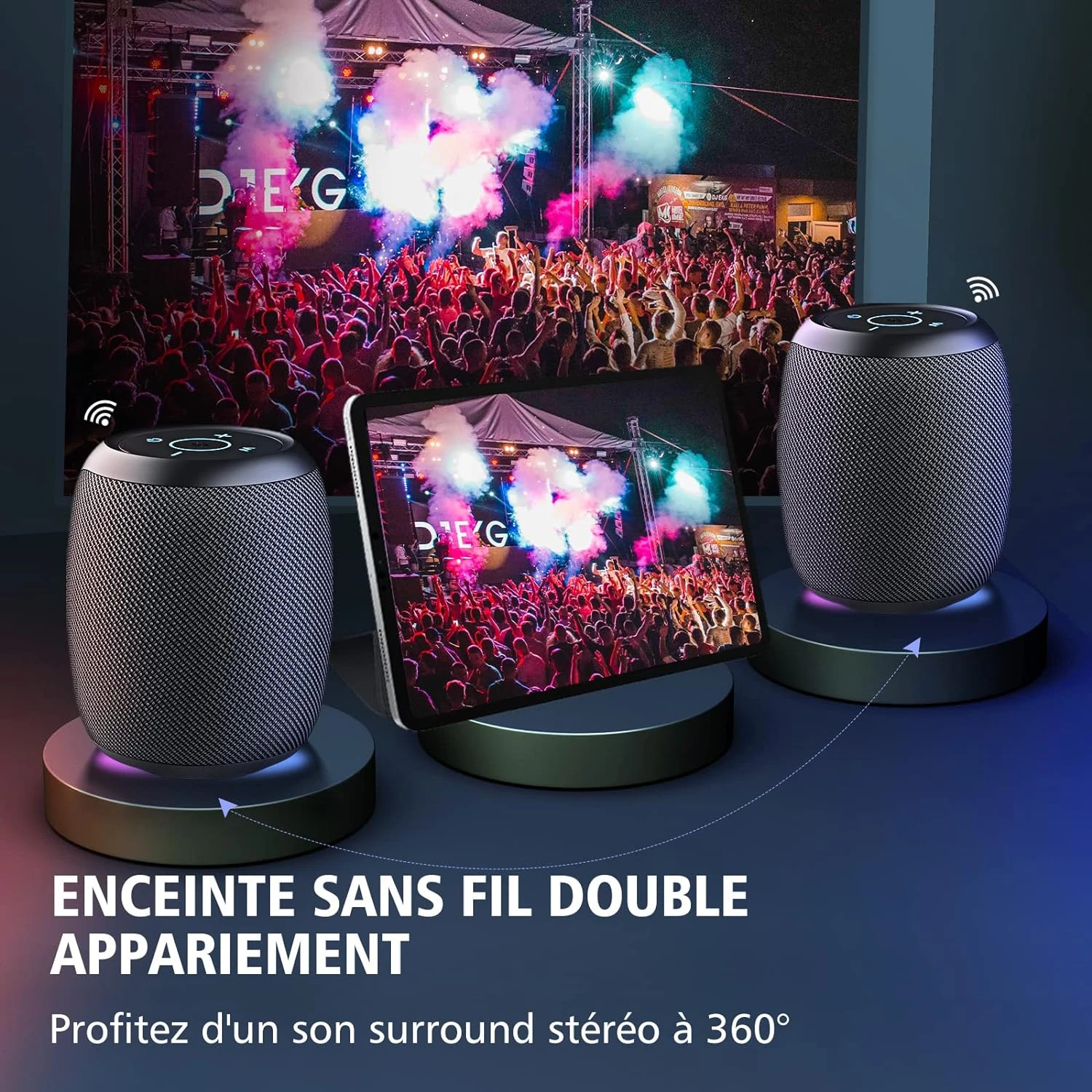Son Stéréo Hi-Fi et Double Appairage 🎵 : Ce haut-parleur sans fil dispose d’un pilote audio stéréo intégré de 10 W qui offre un son puissant sans distorsion, même au volume maximum. La version mise à jour permet un appairage automatique entre deux enceintes, créant un son stéréo HD surround à 360°.