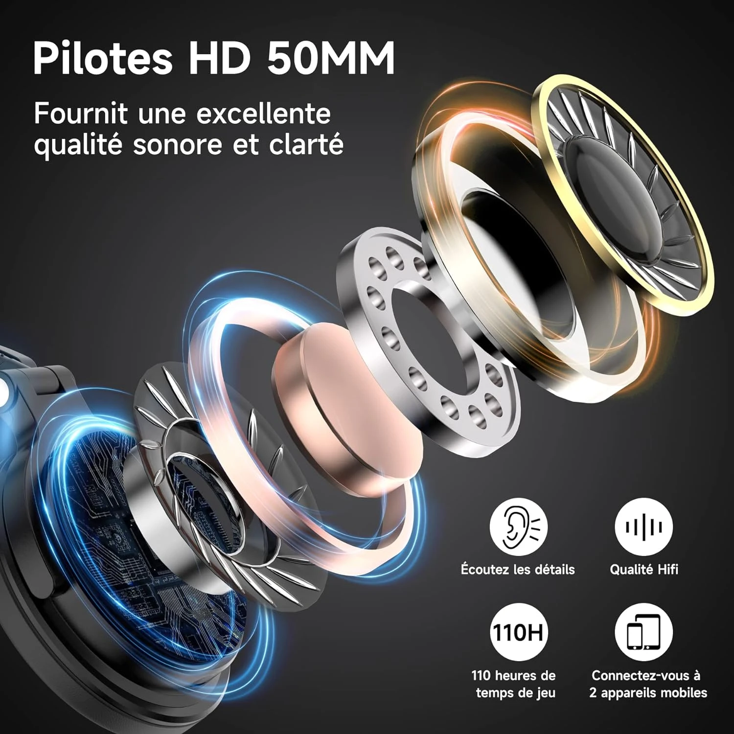 Qualité sonore Hi-Res par une équipe audio professionnelle : Doté de panneaux en aluminium personnalisés pour des basses améliorées et de pilotes dynamiques au néodyme de 50 mm, notre casque offre un son stéréo d’une clarté époustouflante. Les basses sont puissantes, et les voix sont nettes, vous permettant de percevoir chaque détail de votre musique. Plongez dans une expérience audio immersive 🎵.