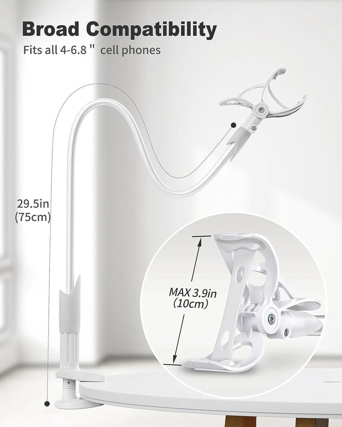 Le bras flexible et robuste, d’une longueur dépliée de 75 centimètres et d’un diamètre de 8,5 mm, garantit une stabilité exceptionnelle. Une fois en forme, il maintient solidement votre téléphone, même lorsque celui-ci est suspendu à l’extrémité du bras 😊.