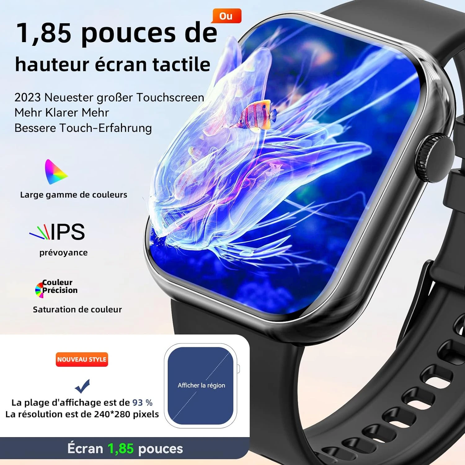 💬 Écran Tactile Haute Définition de 1,85 Pouce Profitez d’un grand écran tactile de 1,85 pouce offrant une qualité d’image HD exceptionnelle. Avec plus de 100 cadrans disponibles et la possibilité de personnaliser votre propre cadran, notre montre combine esthétique et légèreté pour une expérience visuelle et tactile inégalée.