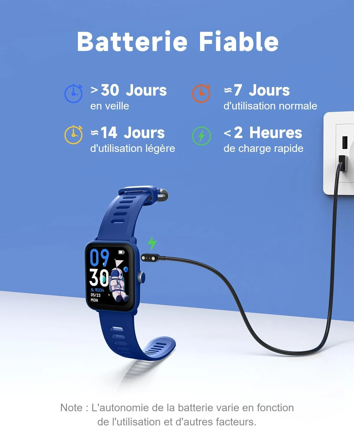 Notre montre suit automatiquement les pas, la distance parcourue, les calories brûlées et les minutes d’activité. Elle prend également en charge 14 modes de sport : marche, course, natation, basket-ball, et bien d’autres, pour encourager les jeunes à rester actifs et à s’amuser.