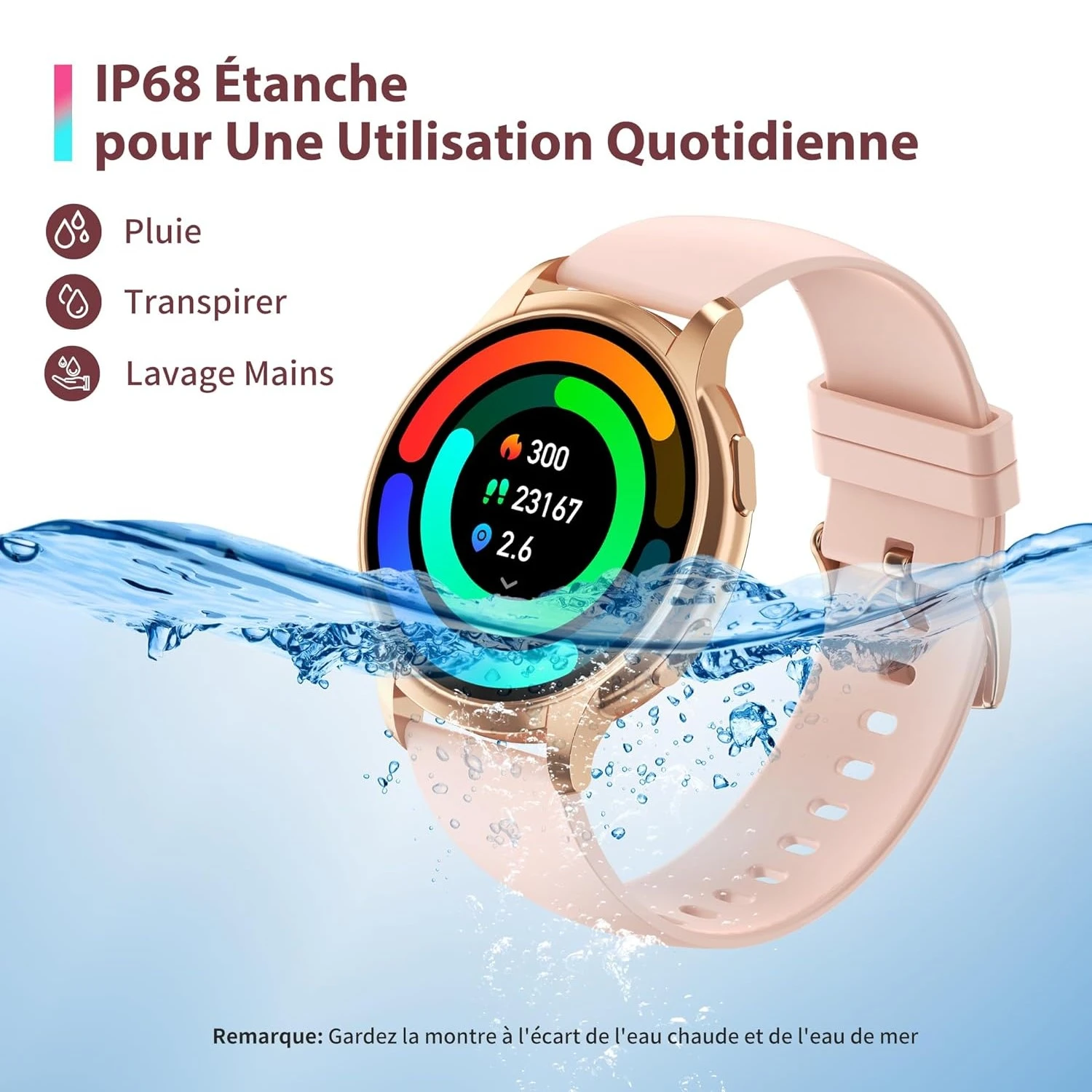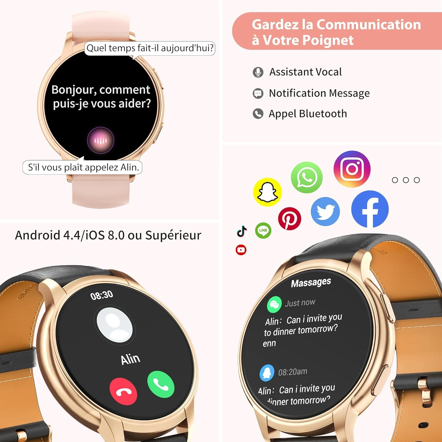 📞 Communication au bout des doigts : Répondez aux appels directement depuis votre poignet grâce au Bluetooth haute définition qui assure des conversations stables et claires. Recevez également des rappels de messages, qu’il s’agisse de textos, d’appels téléphoniques ou de notifications sur les réseaux sociaux, pour rester informée en toute circonstance.
