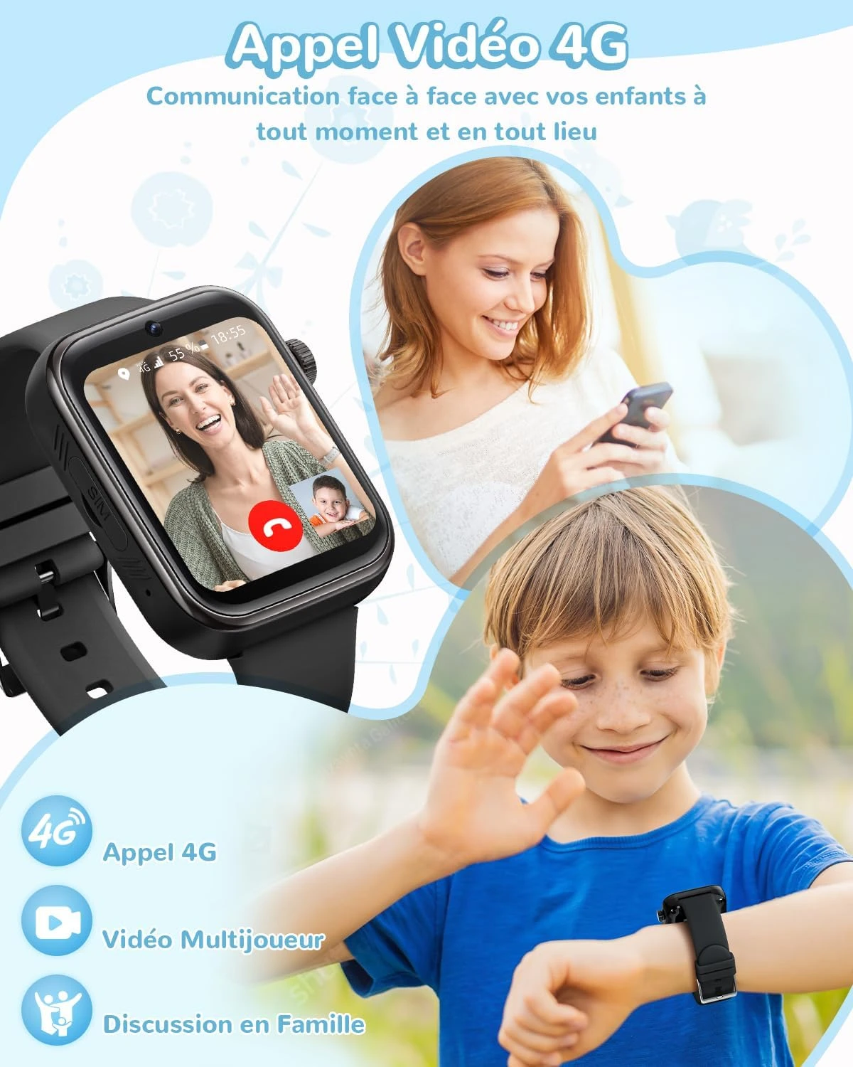 📞 Appel vidéo HD en 4G pour rester proche : Grâce à sa connexion 4G et son écran haute définition de 1,83 pouce, cette montre permet aux enfants de passer des appels vidéo de qualité en temps réel avec leurs parents. La montre supporte également les discussions de groupe, offrant la possibilité d’échanger facilement avec toute la famille.