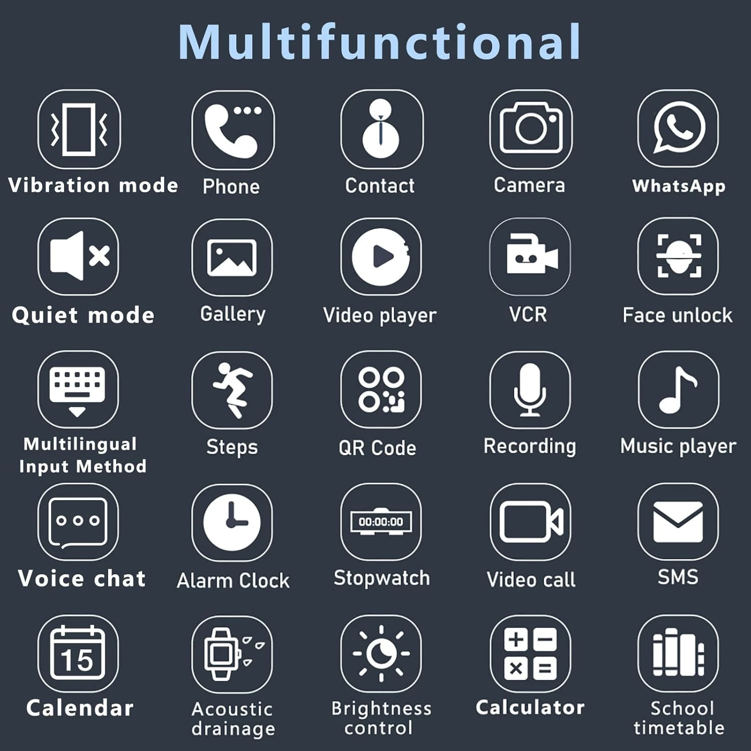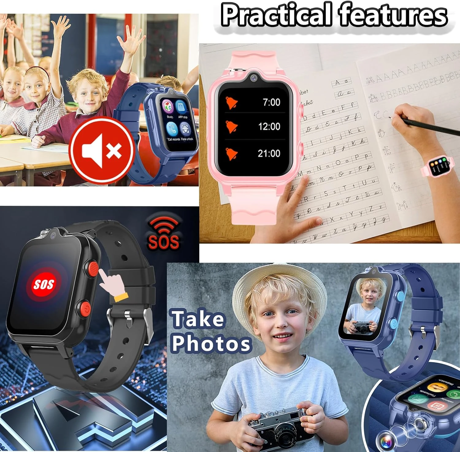 🕹️ Multifonctionnalité intelligente : La montre est équipée de multiples fonctions, notamment la messagerie SMS, un podomètre, des jeux éducatifs, une alarme, un mode classe, et même un App Store. Les enfants peuvent ainsi profiter d’applications populaires comme WhatsApp, Google Traduction ou encore Gboard. Son écran ajustable et son mode silencieux permettent une utilisation discrète et pratique en classe.