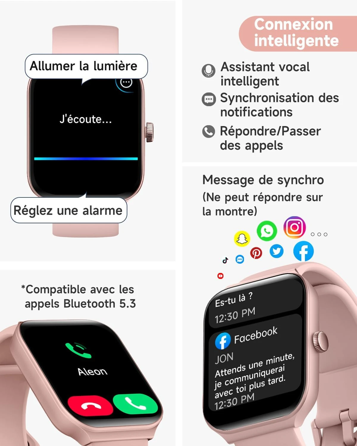 😊 Restez Connectée en Tout Temps : Ne manquez plus jamais un appel ou une notification importante. Grâce à la connectivité Bluetooth, recevez vos appels téléphoniques, messages, e-mails et notifications de réseaux sociaux directement sur votre montre. Simplifiez votre routine quotidienne en gérant tout depuis votre poignet, même en déplacement.