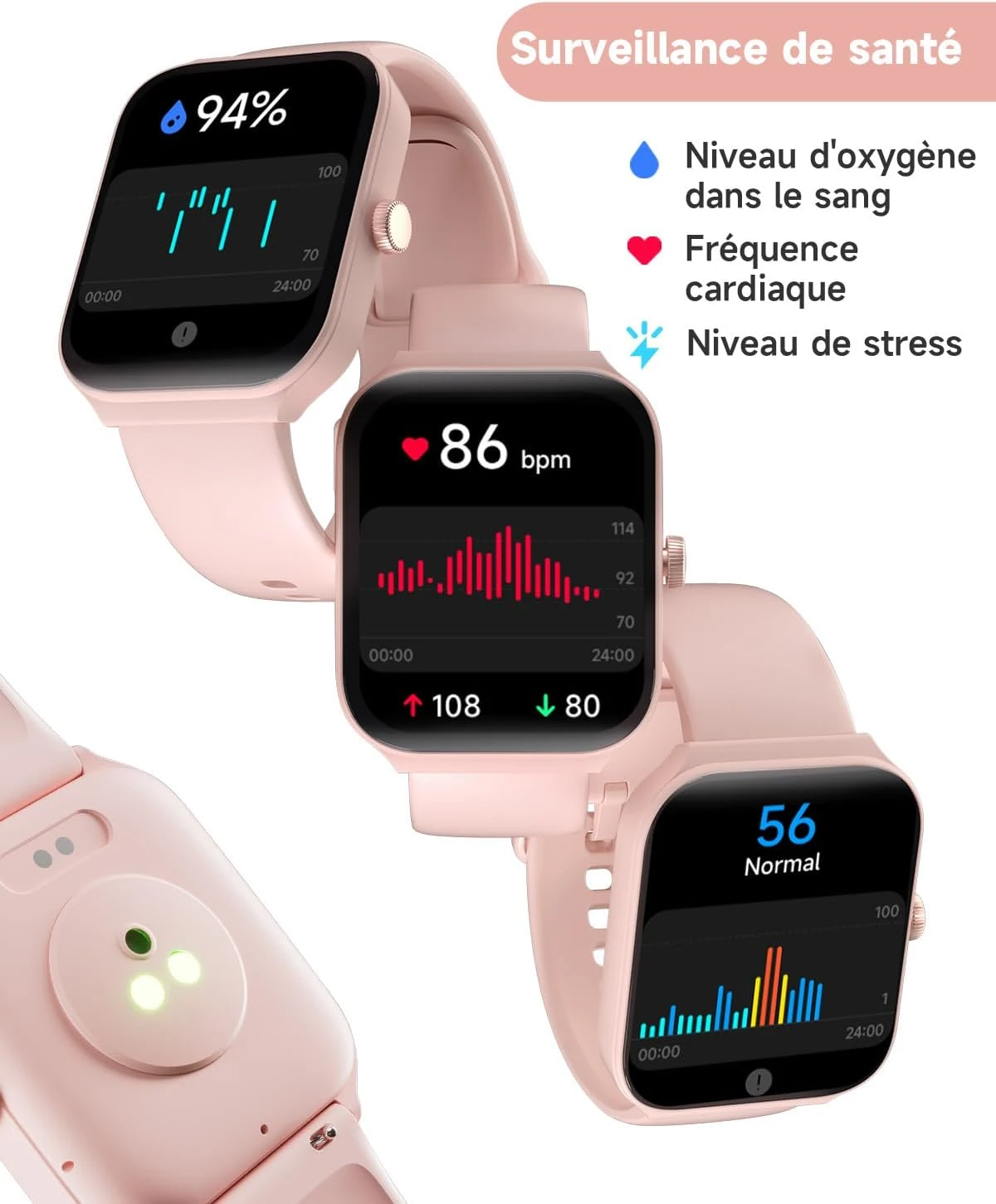 💗 Suivi de la Santé et du Sport : Prenez soin de votre santé avec un suivi en temps réel de votre fréquence cardiaque et de votre niveau de stress. La montre vous alerte en cas d’anomalie pour vous aider à rester en forme. Avec 100 modes sportifs, suivez vos pas, les calories brûlées, la distance parcourue et plus encore, quel que soit le sport que vous pratiquez.