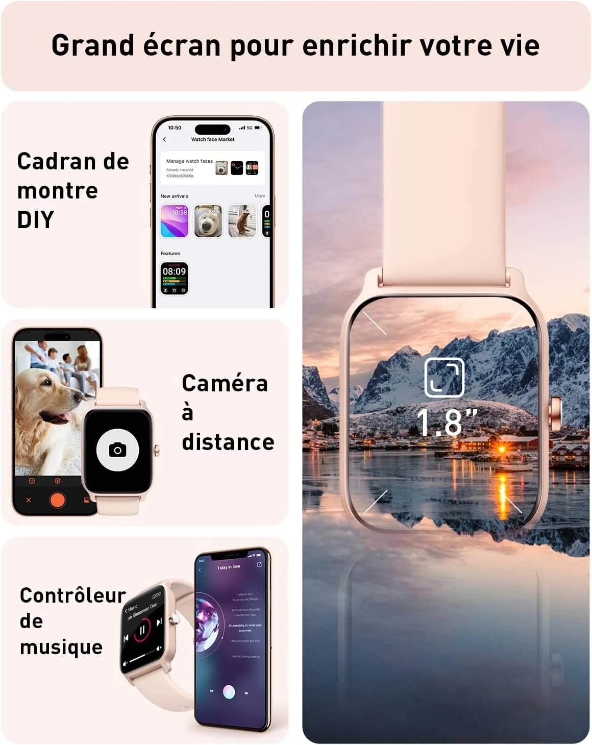 ⌚ Écran de 1,8″ et Cadran Personnalisable : Admirez l’écran tactile HD de 1,8 pouce avec une résolution de 240×284. Profitez d’une réponse tactile fluide et d’une qualité d’image exceptionnelle. Personnalisez votre montre avec plus de 100 cadrans disponibles dans l’application “VeryFit” ou créez votre propre design unique.