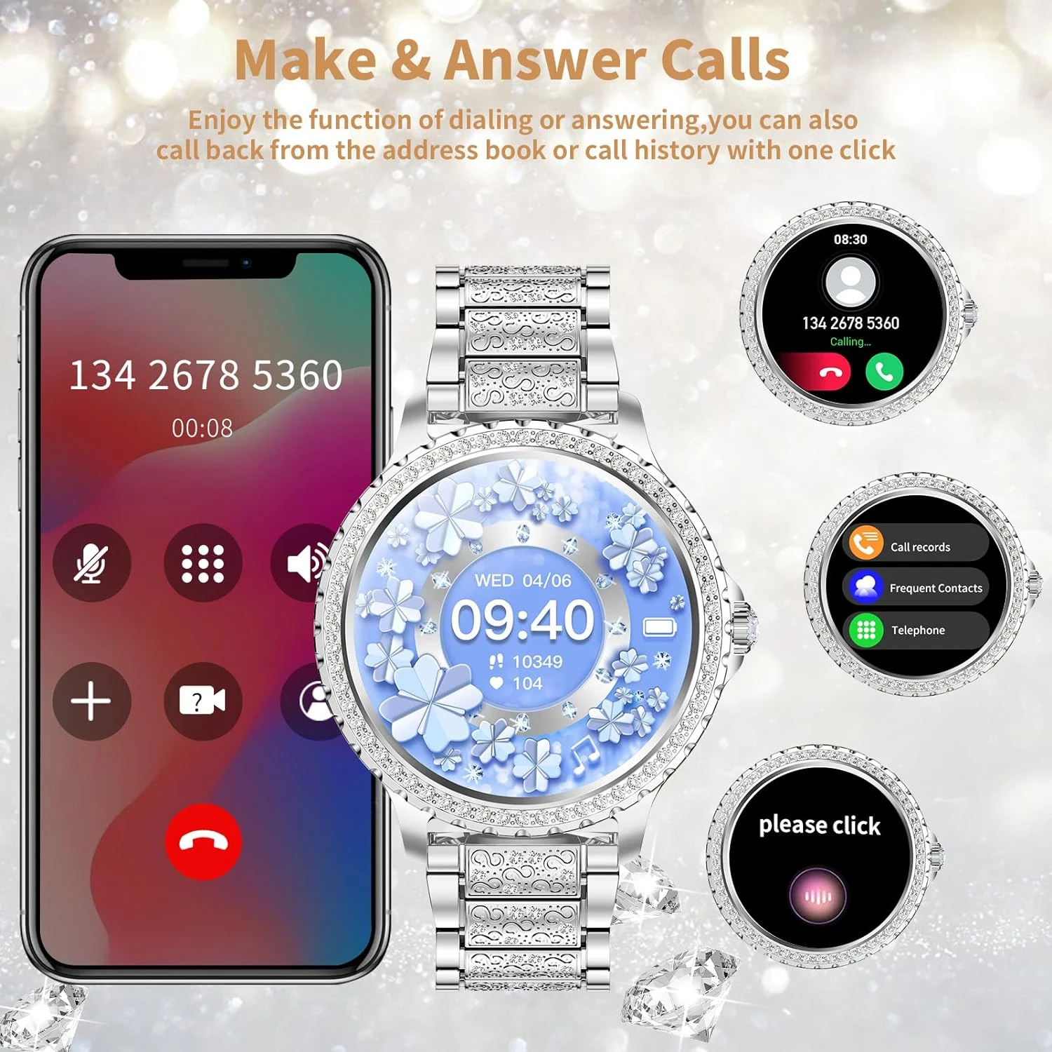 ⌚️ Avec 146 diamants brillants incrustés dans son design, cette montre conjugue sophistication et style sportif pour un look à la fois éclatant et noble. Mais notre montre connectée femme ne se contente pas d’être belle, elle est aussi intelligente.